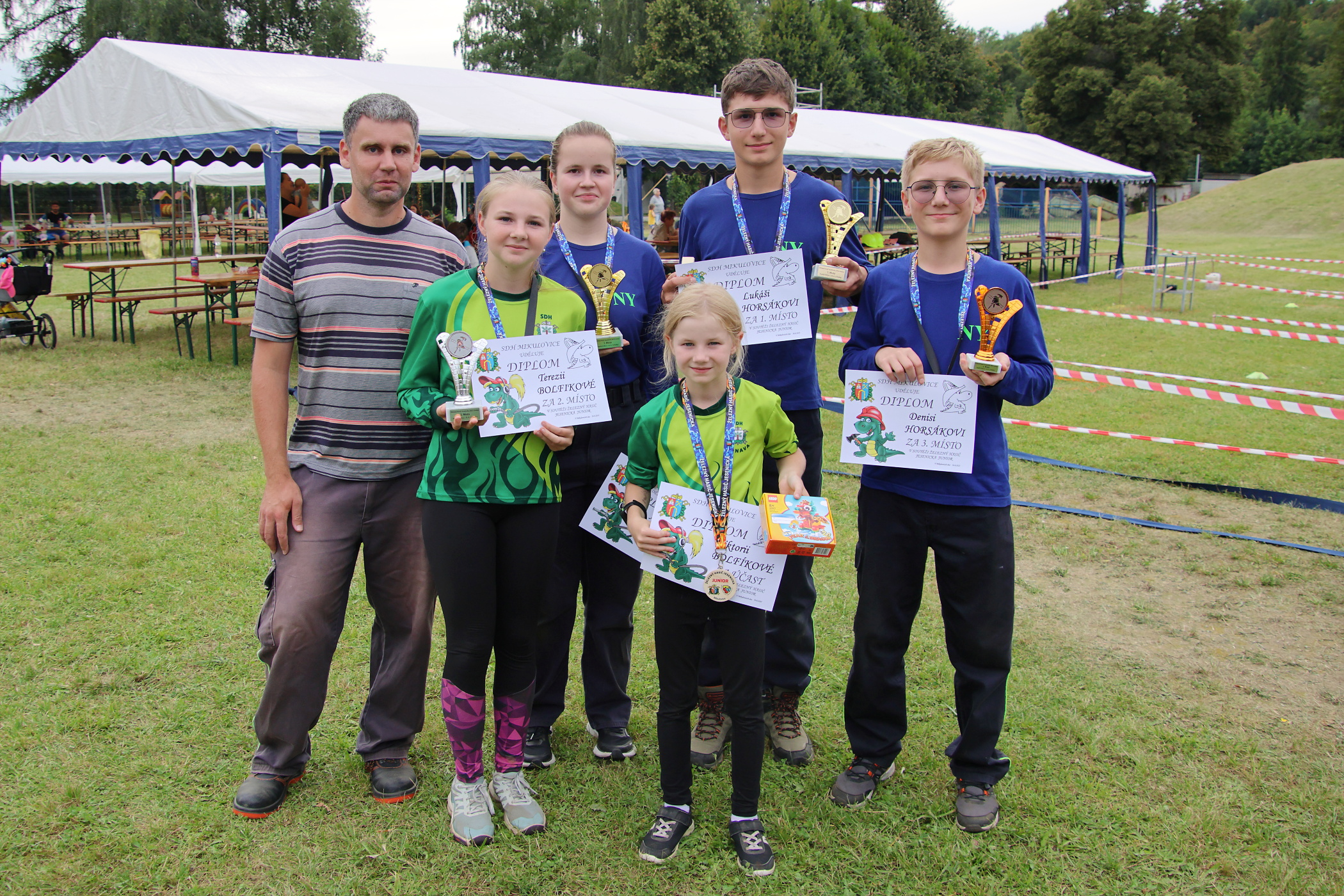 Ráno jsme se na místo dostavili s mladými hasiči Mercedesem. Po nástupu se začalo soutěžit na travnaté ploše přímo za domem s pečovatelskou službou. V rámci mladší kategorie se dostavila dvě družstva z Bernartic, tři z Lipové Lázně, jedno ze Staré Červené Vody, dvě z Velké Kraše a jedno ze Zlatých Hor. My jsme měli jen družstvo starších. V této kategorii nastoupila ještě družstva z Bernartic, dvě z Lipové Lázně, Velké Kraše a Zlatých Hor.