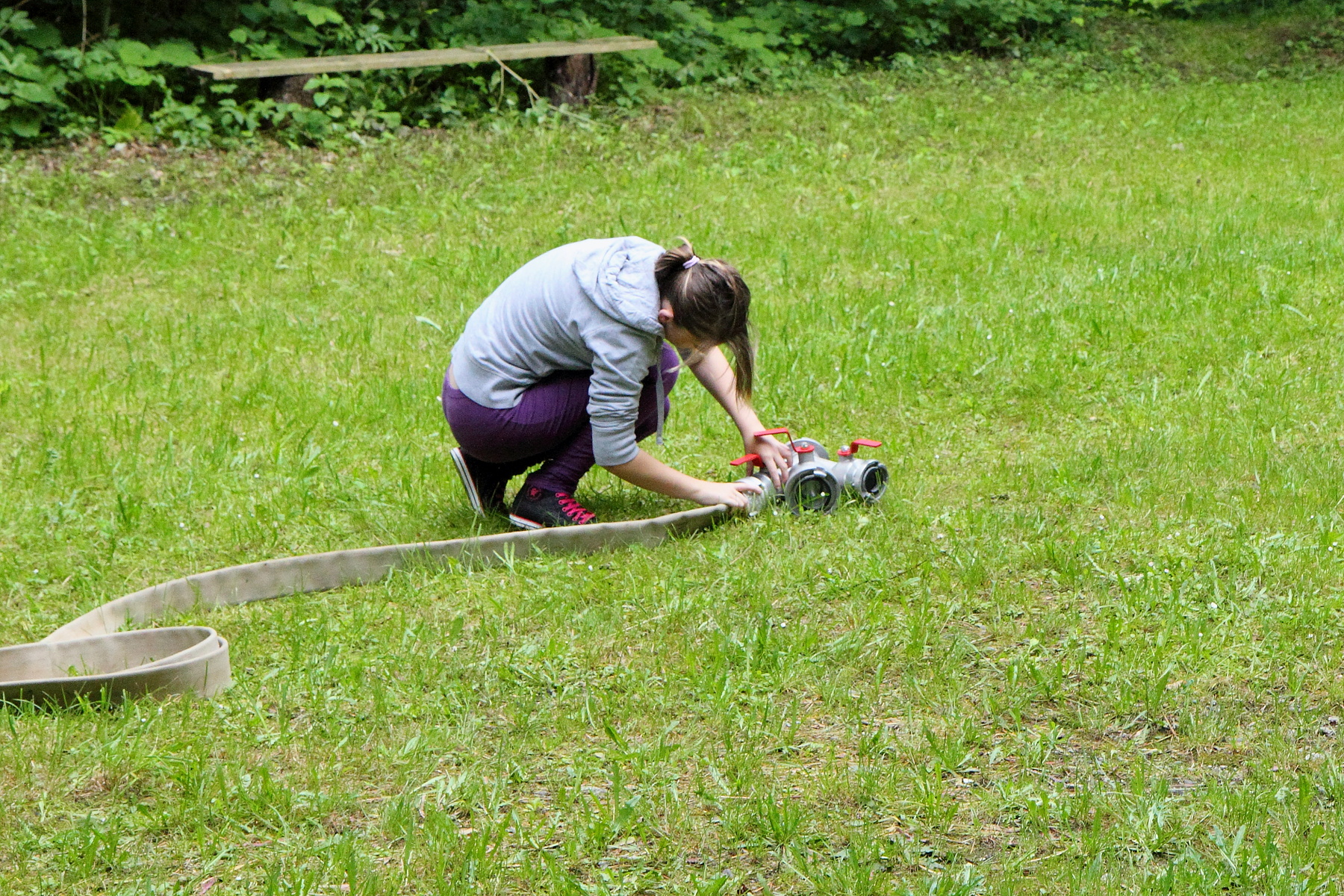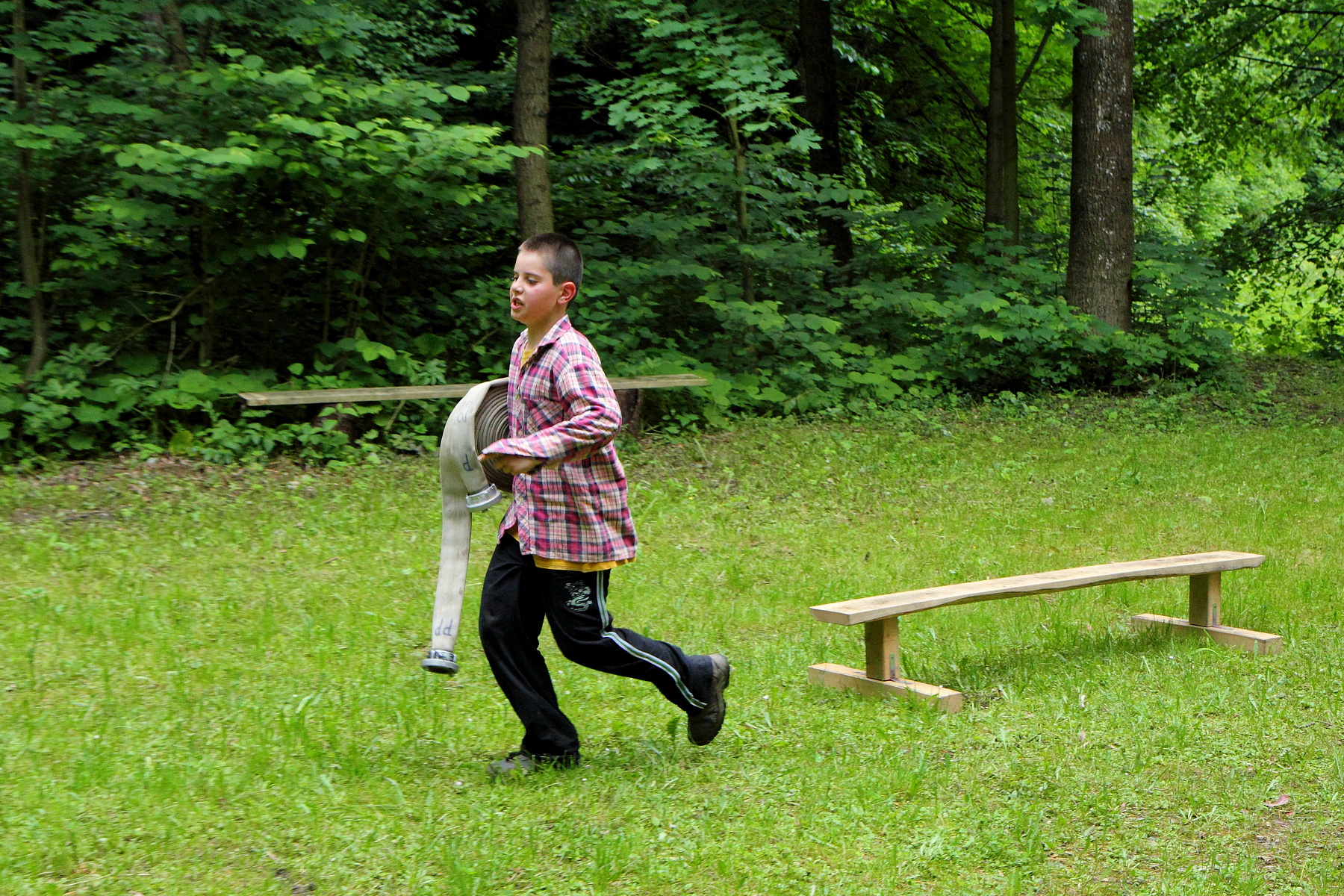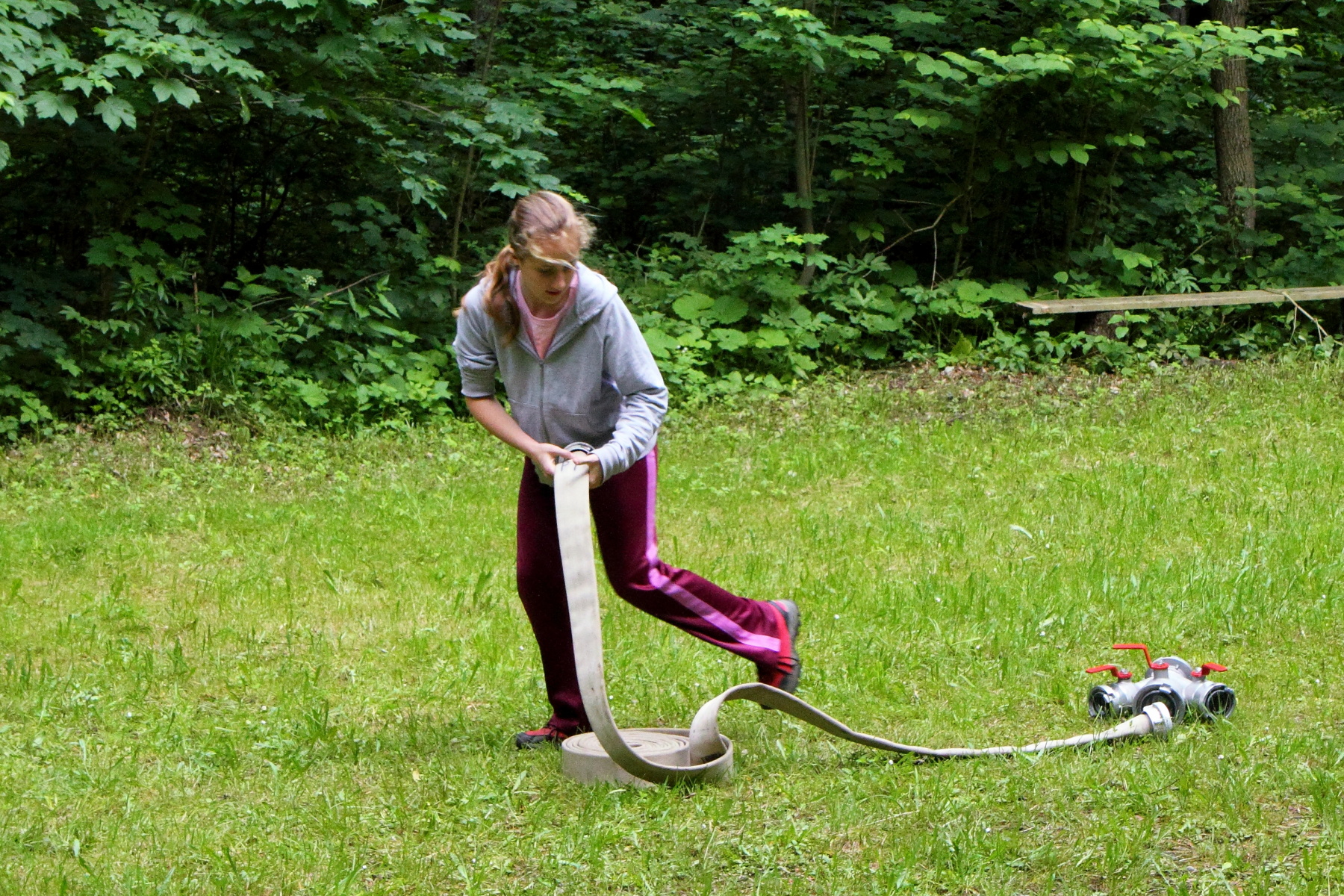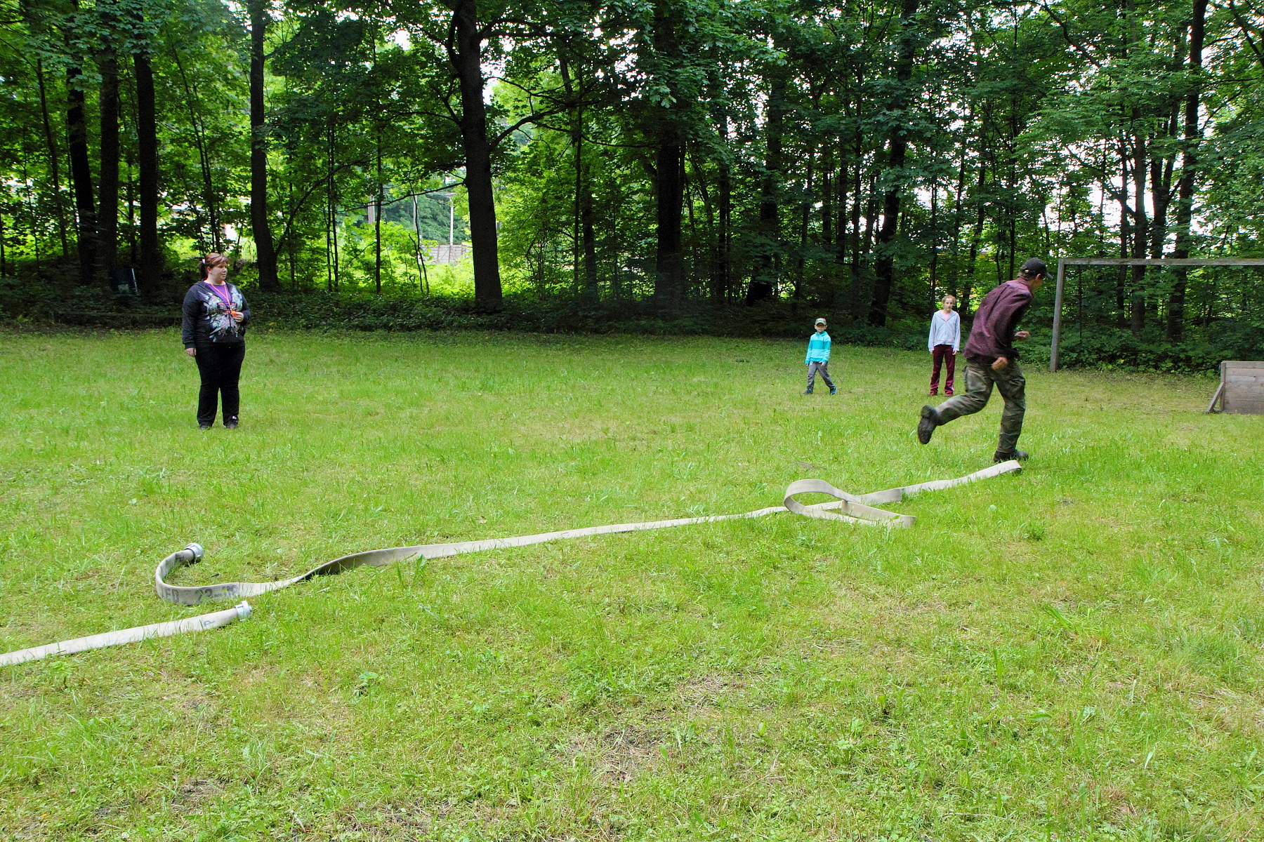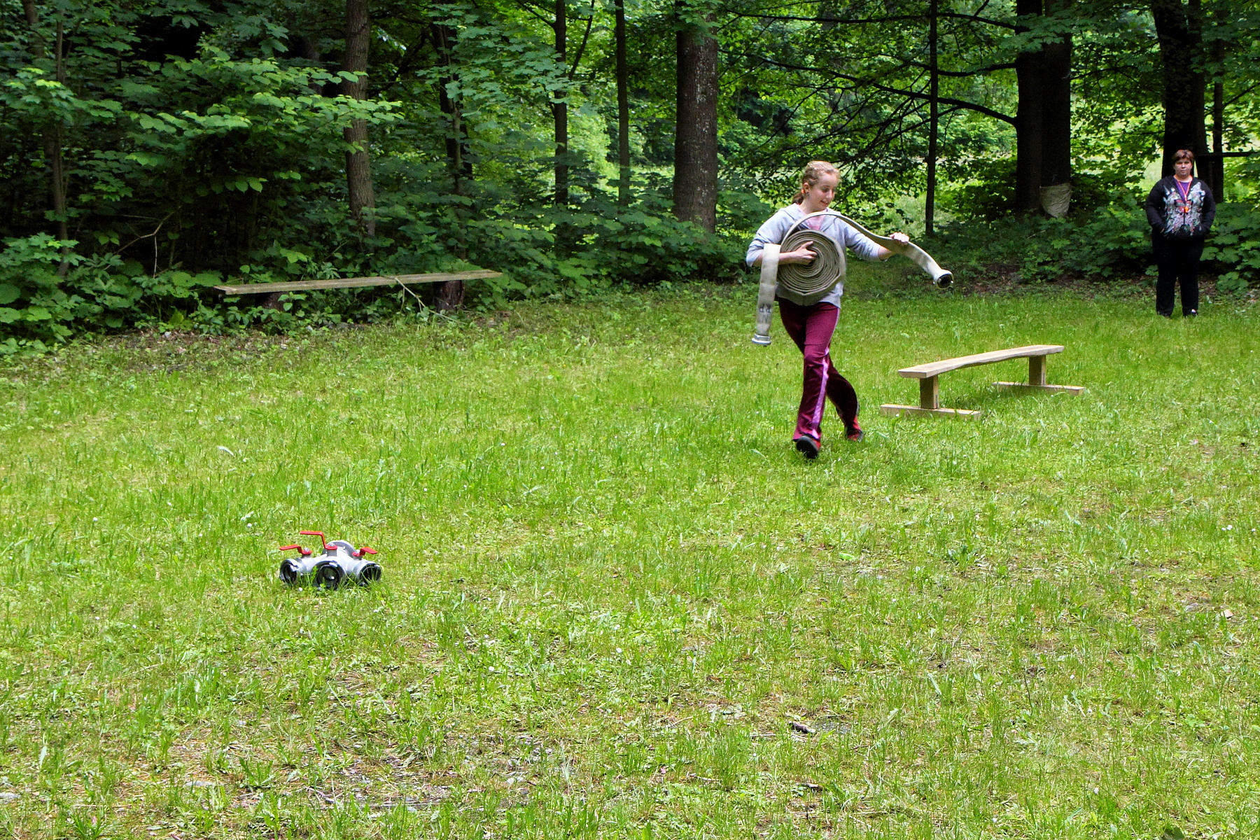 Během této disciplíny soutěžící proběhne první soutěžící celou trať, kdy překoná kladinu a nízkou bariéru v cíli. Druhý soutěžící v pořadí se vyzbrojí hadicí C, překoná kladinu a u rozdělovače hadici rozvine. Třetí účastník rozvine další hadici, čtvrtý účastník propojí první hadici s rozdělovačem a spojení obě hadice. Poslední soutěžící vybíhá s proudnicí, kterou zapojí na konec hadicového vedení.