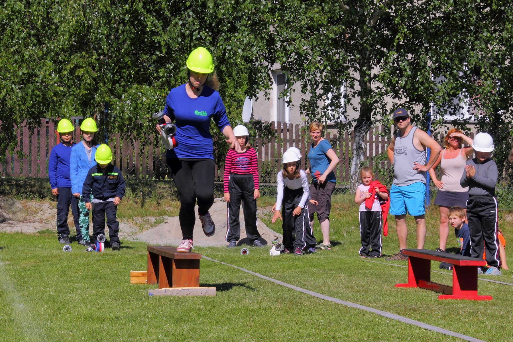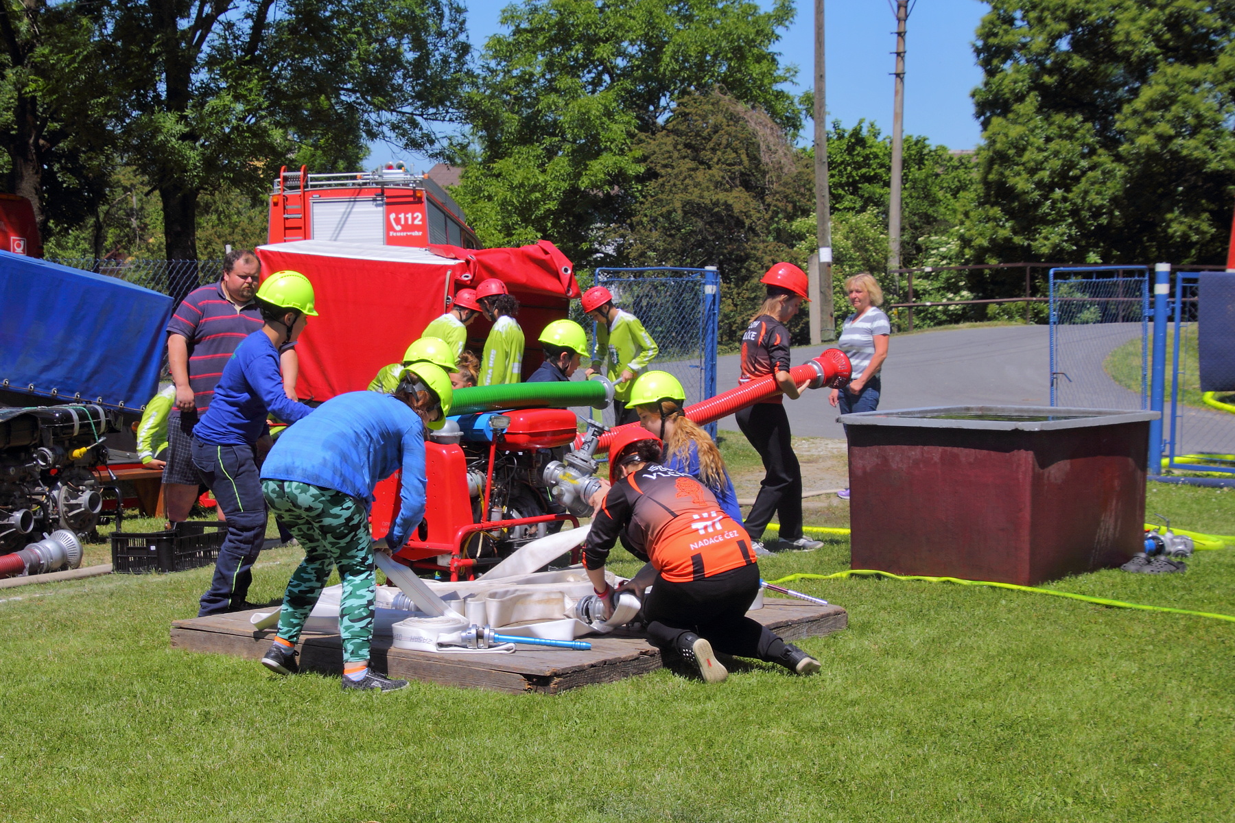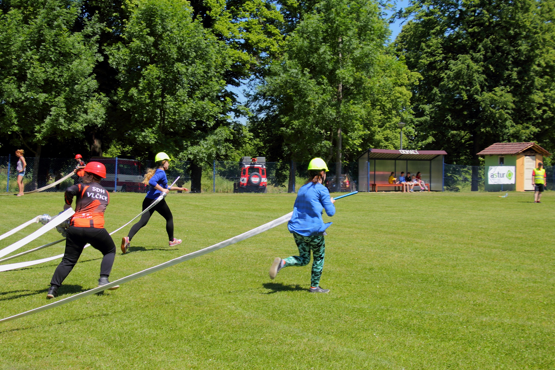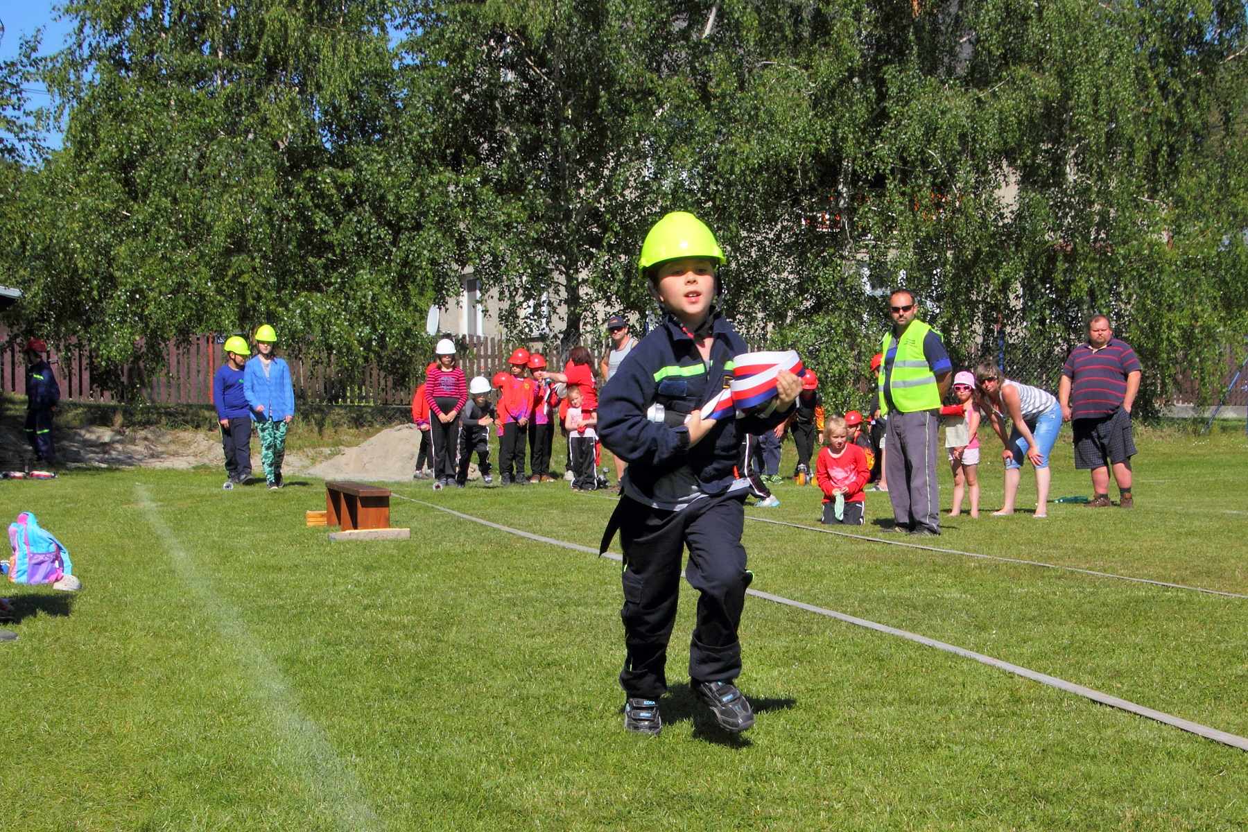 Po nástupu začaly štafety. Při štafetě 5 x 50 m vybíhají jednotliví soutěžící postupně za sebou. Při této štafetě překonávají lavičku a na konci tratě nízkou bariéru a v prostoru mezi nimi postupně natáhnou a spojí hadicové vedení. Jedná se o napojení první hadice na rozdělovač, druhé hadice na tu první a na konec druhé hadice je napojena proudnice. Lépe dopadl našim mladým hasičům druhý pokus, trestné body neobdrželi. Přesto obsadili poslední 10 místo.