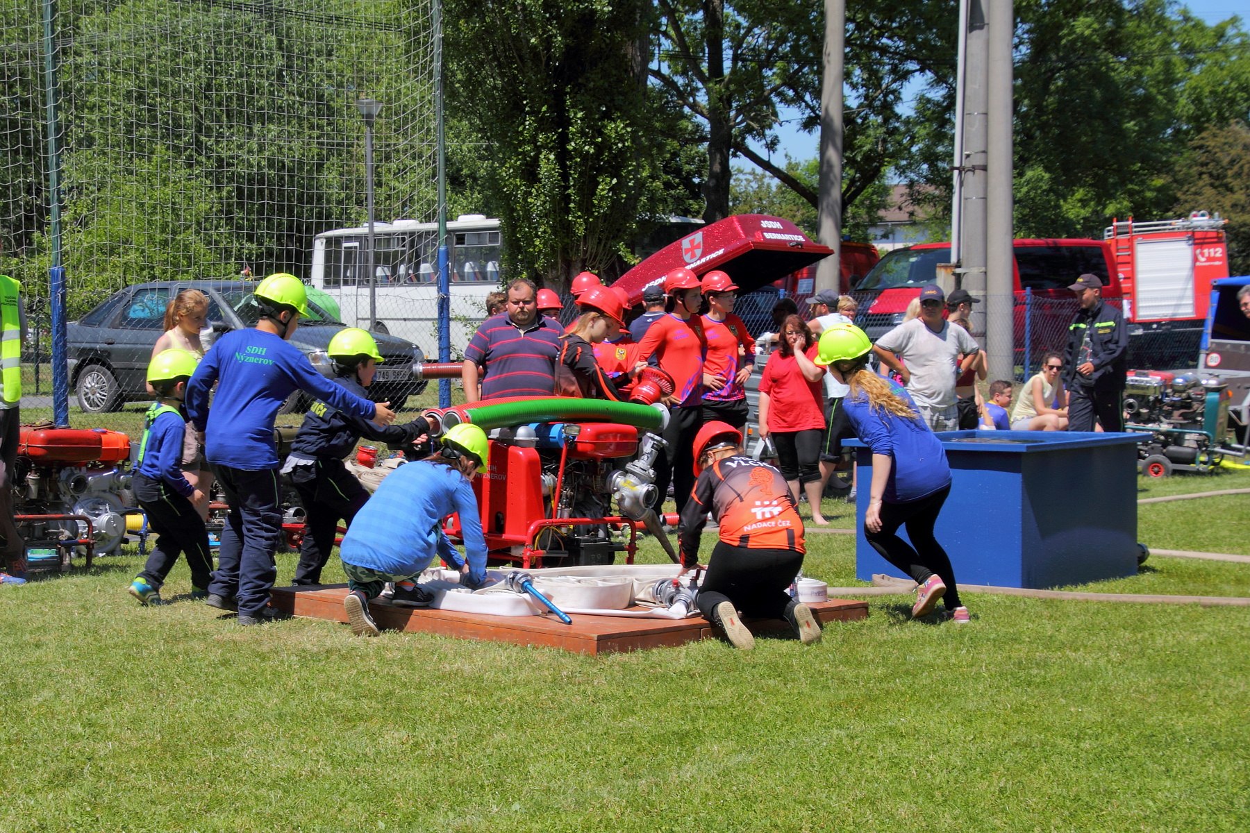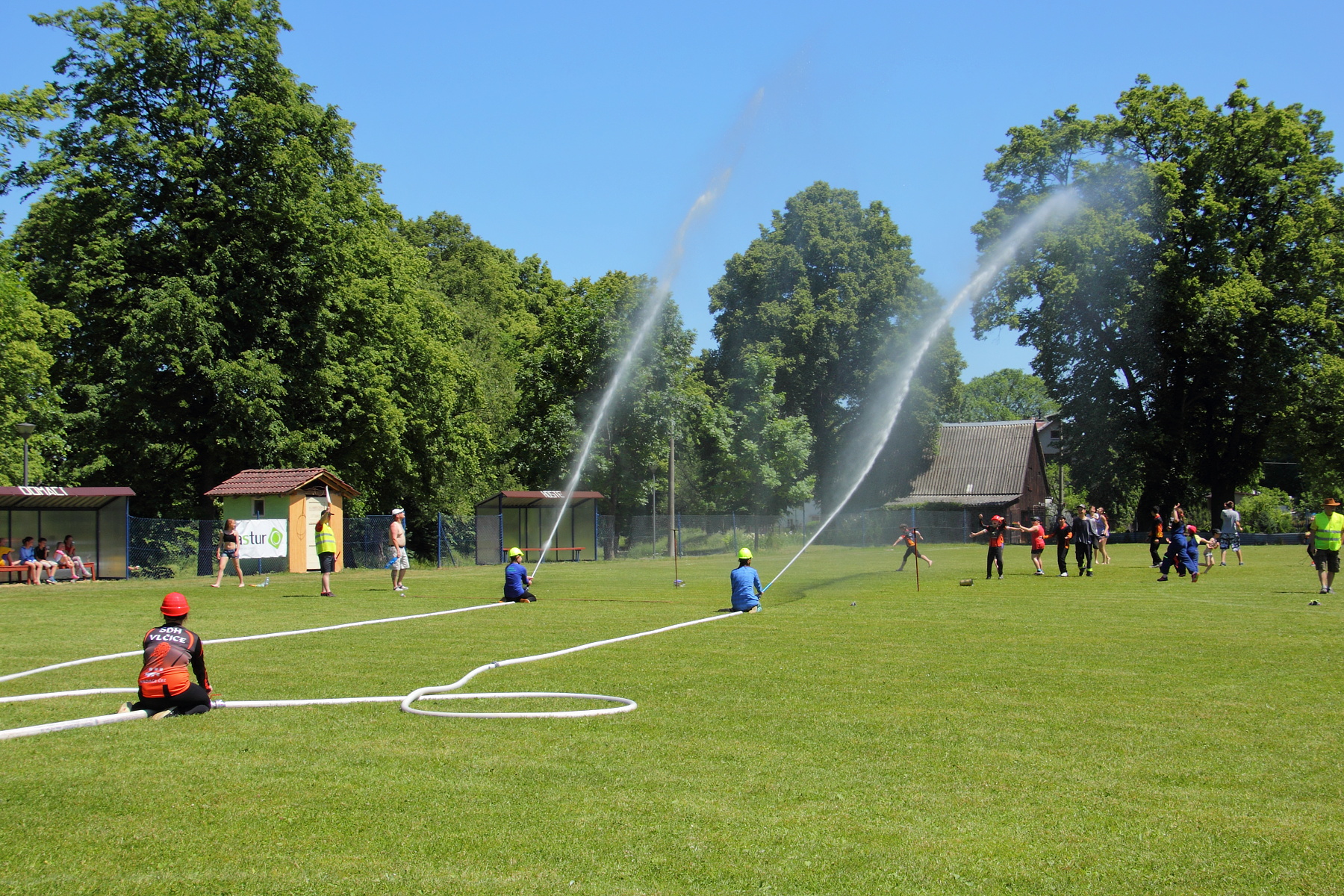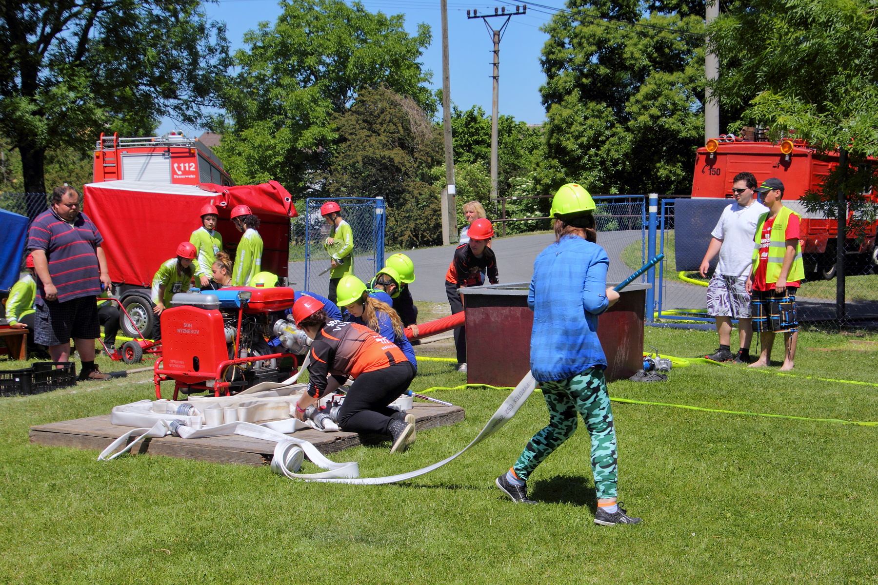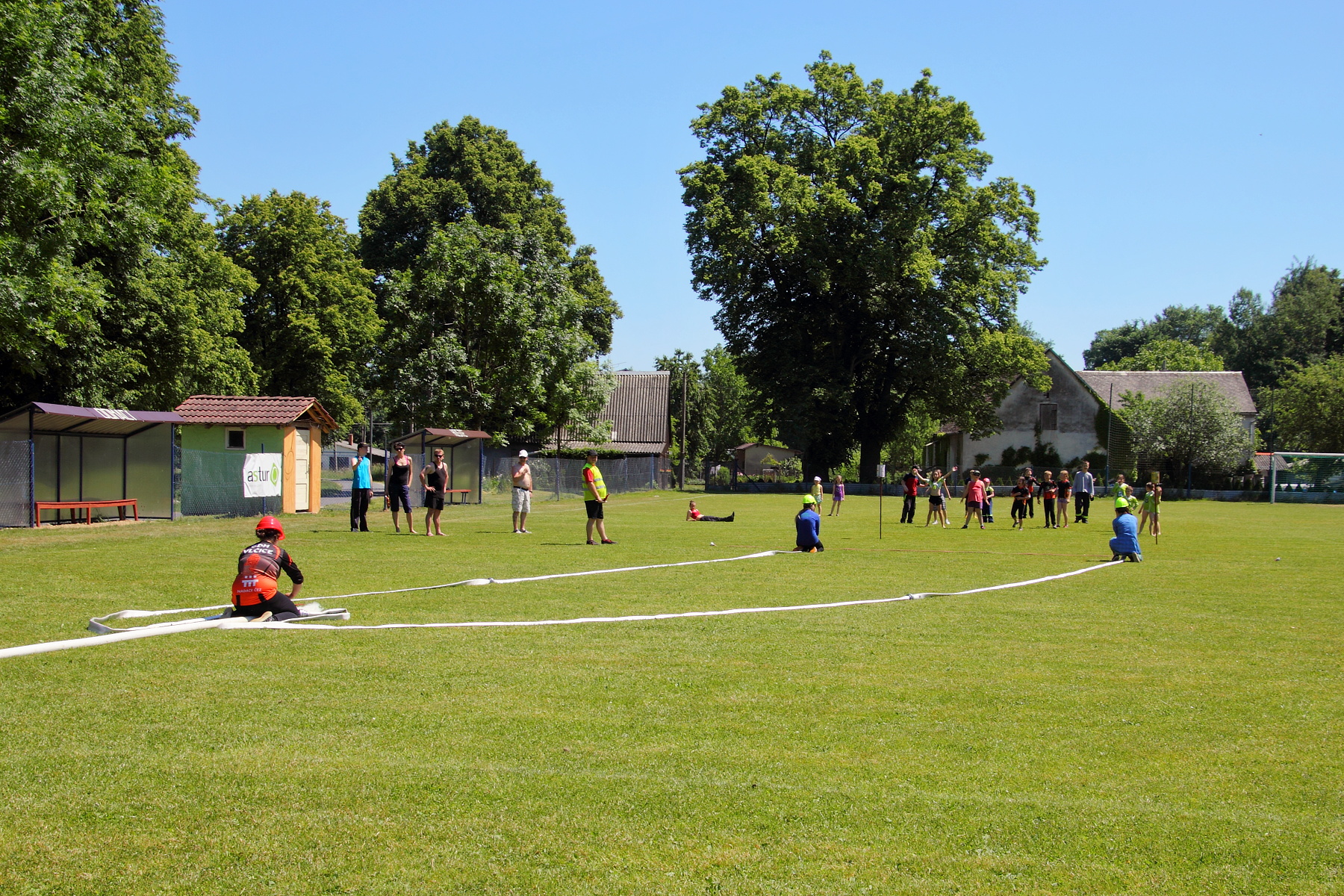 Po nástupu začaly štafety. Při štafetě 5 x 50 m vybíhají jednotliví soutěžící postupně za sebou. Při této štafetě překonávají lavičku a na konci tratě nízkou bariéru a v prostoru mezi nimi postupně natáhnou a spojí hadicové vedení. Jedná se o napojení první hadice na rozdělovač, druhé hadice na tu první a na konec druhé hadice je napojena proudnice. Lépe dopadl našim mladým hasičům druhý pokus, trestné body neobdrželi. Přesto obsadili poslední 10 místo.