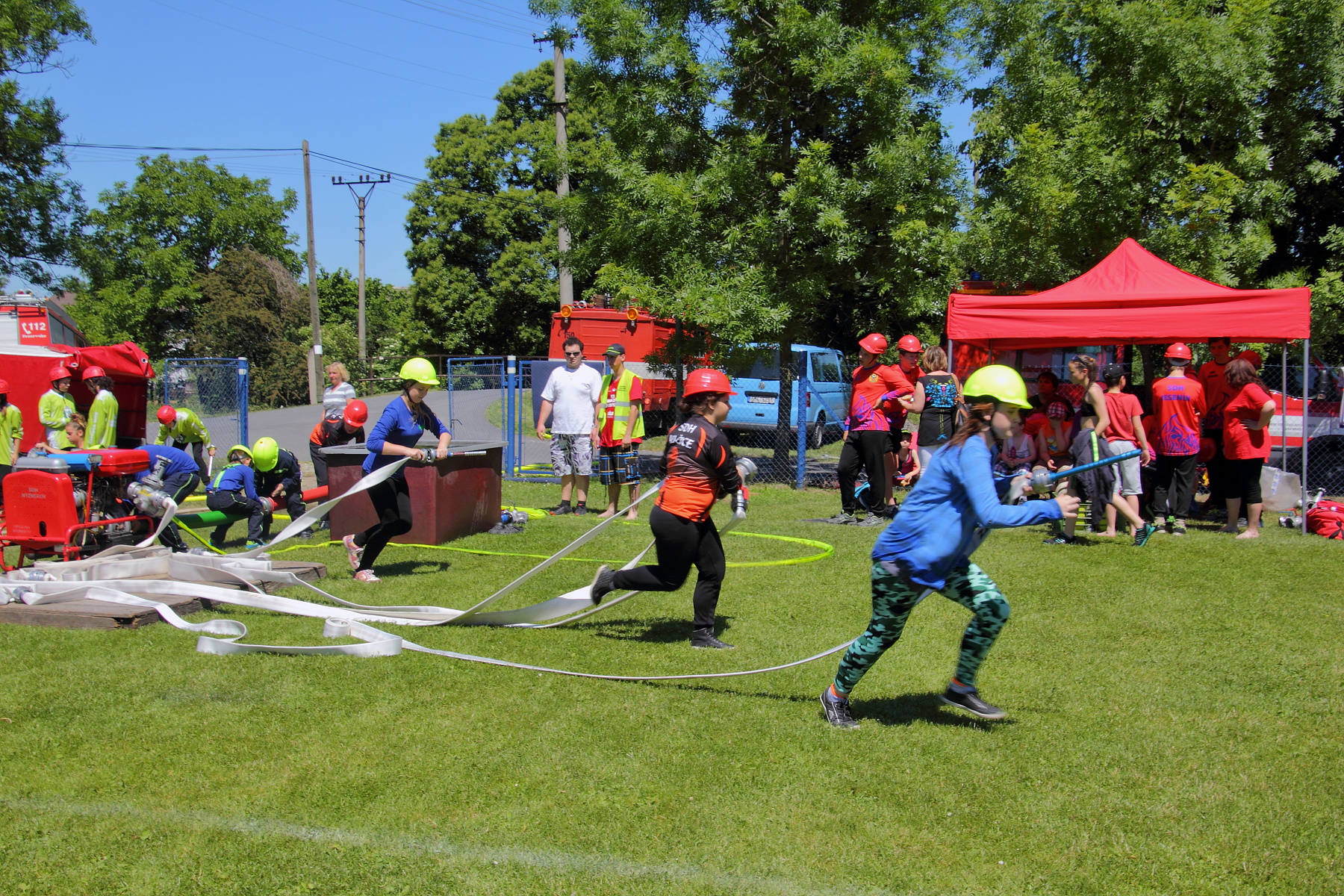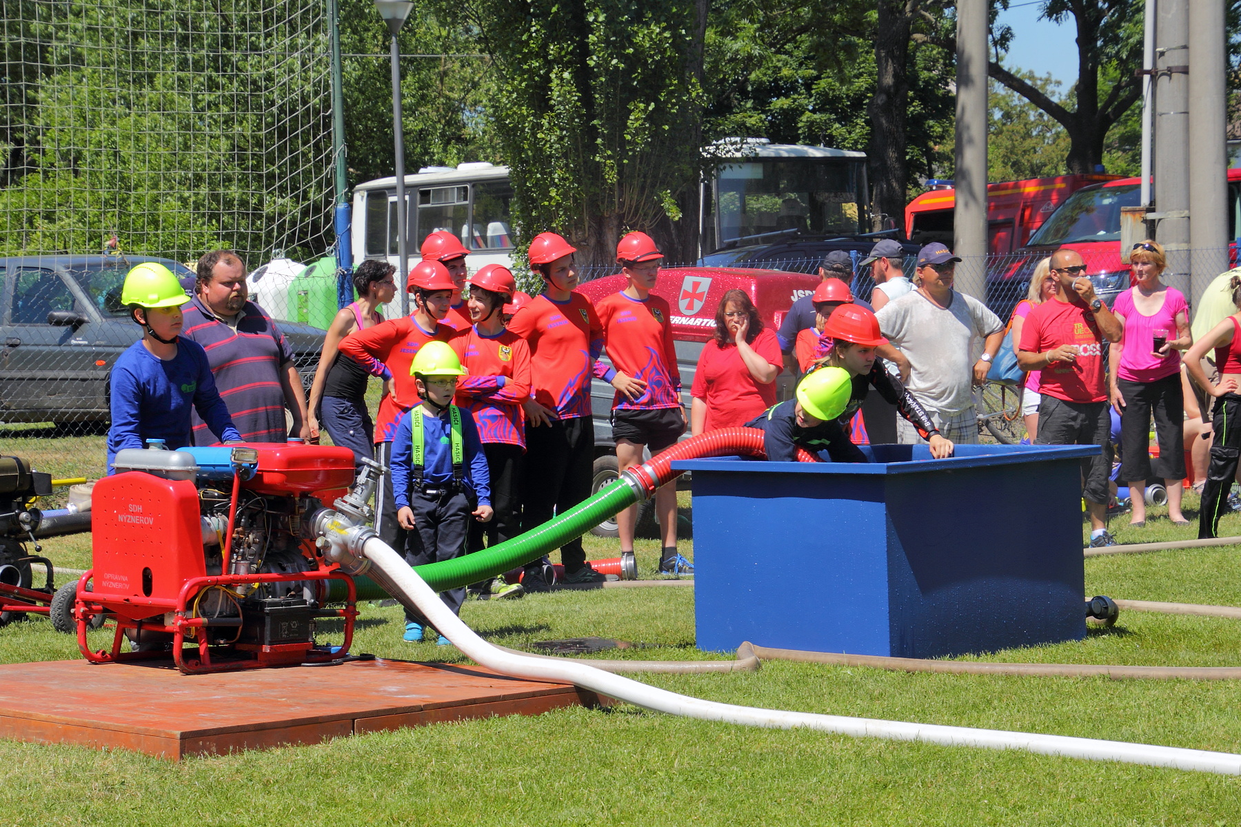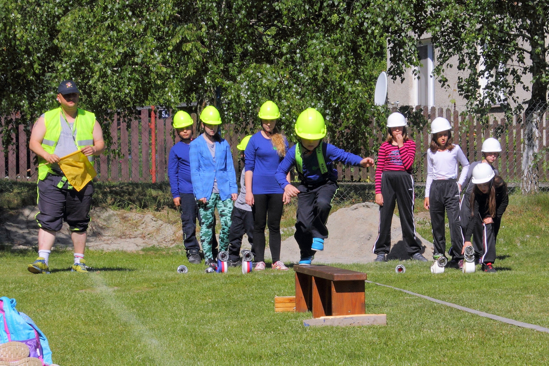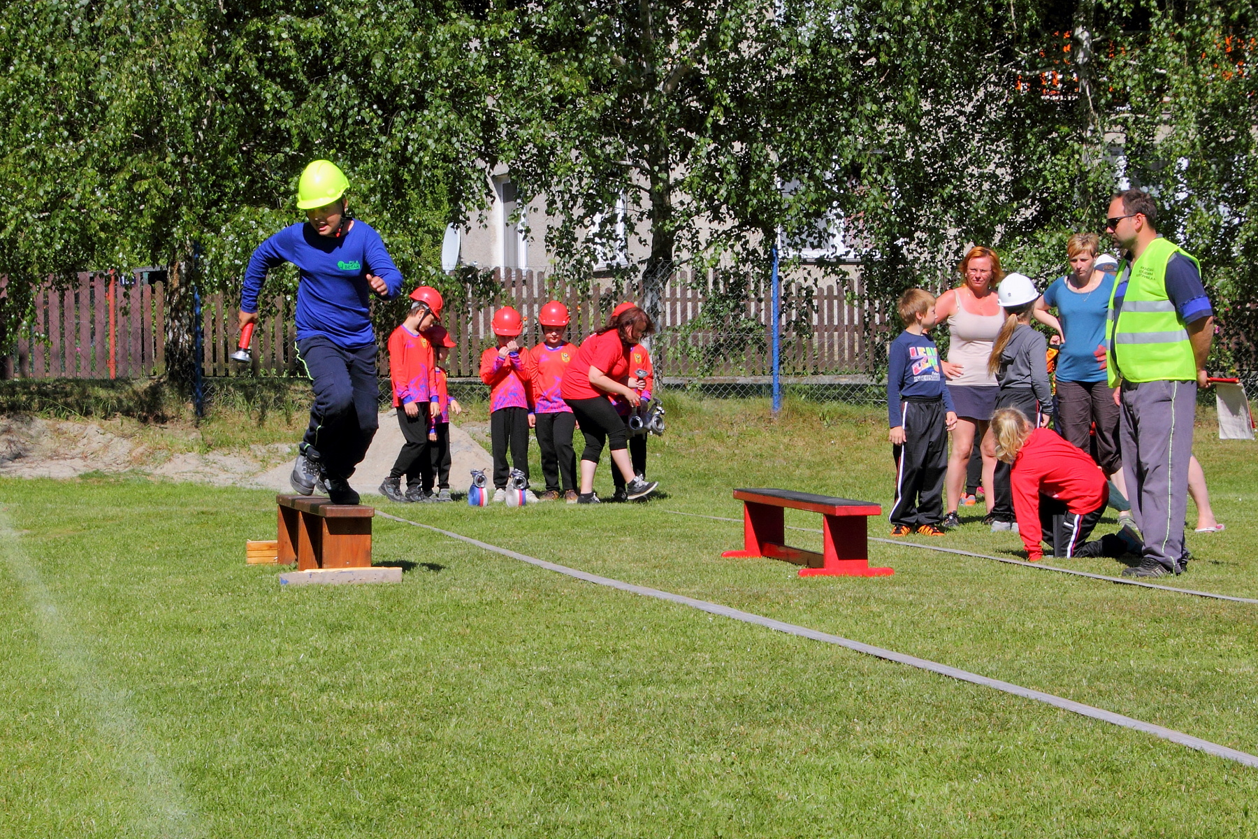 Po nástupu začaly štafety. Při štafetě 5 x 50 m vybíhají jednotliví soutěžící postupně za sebou. Při této štafetě překonávají lavičku a na konci tratě nízkou bariéru a v prostoru mezi nimi postupně natáhnou a spojí hadicové vedení. Jedná se o napojení první hadice na rozdělovač, druhé hadice na tu první a na konec druhé hadice je napojena proudnice. Lépe dopadl našim mladým hasičům druhý pokus, trestné body neobdrželi. Přesto obsadili poslední 10 místo.