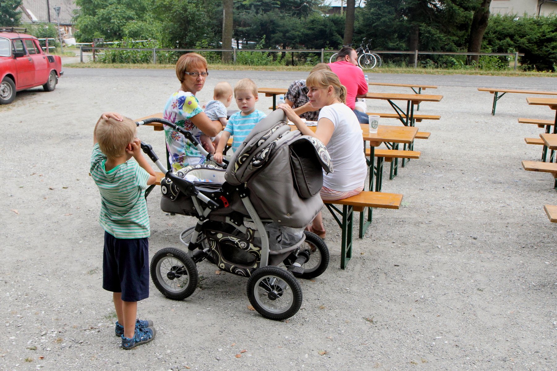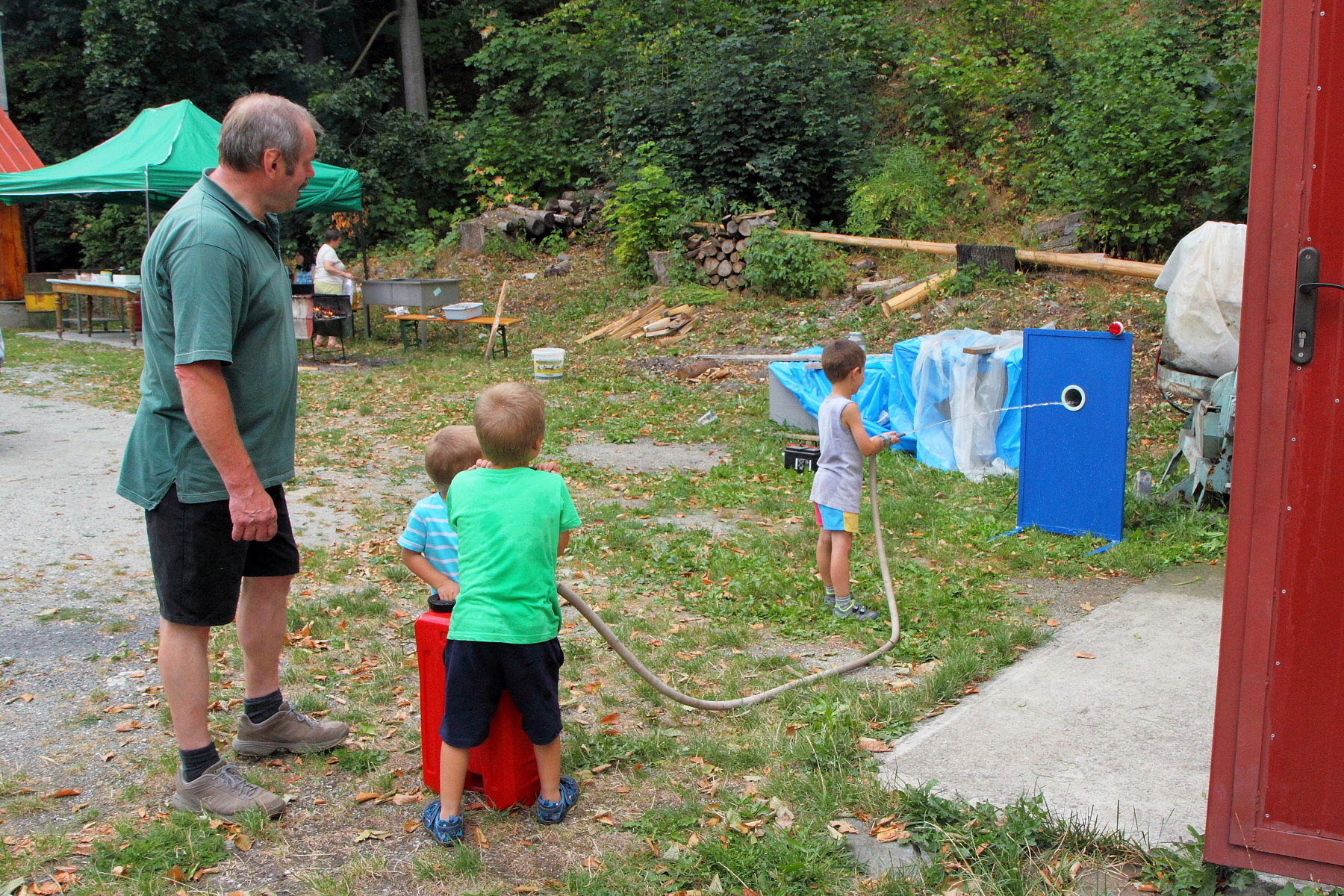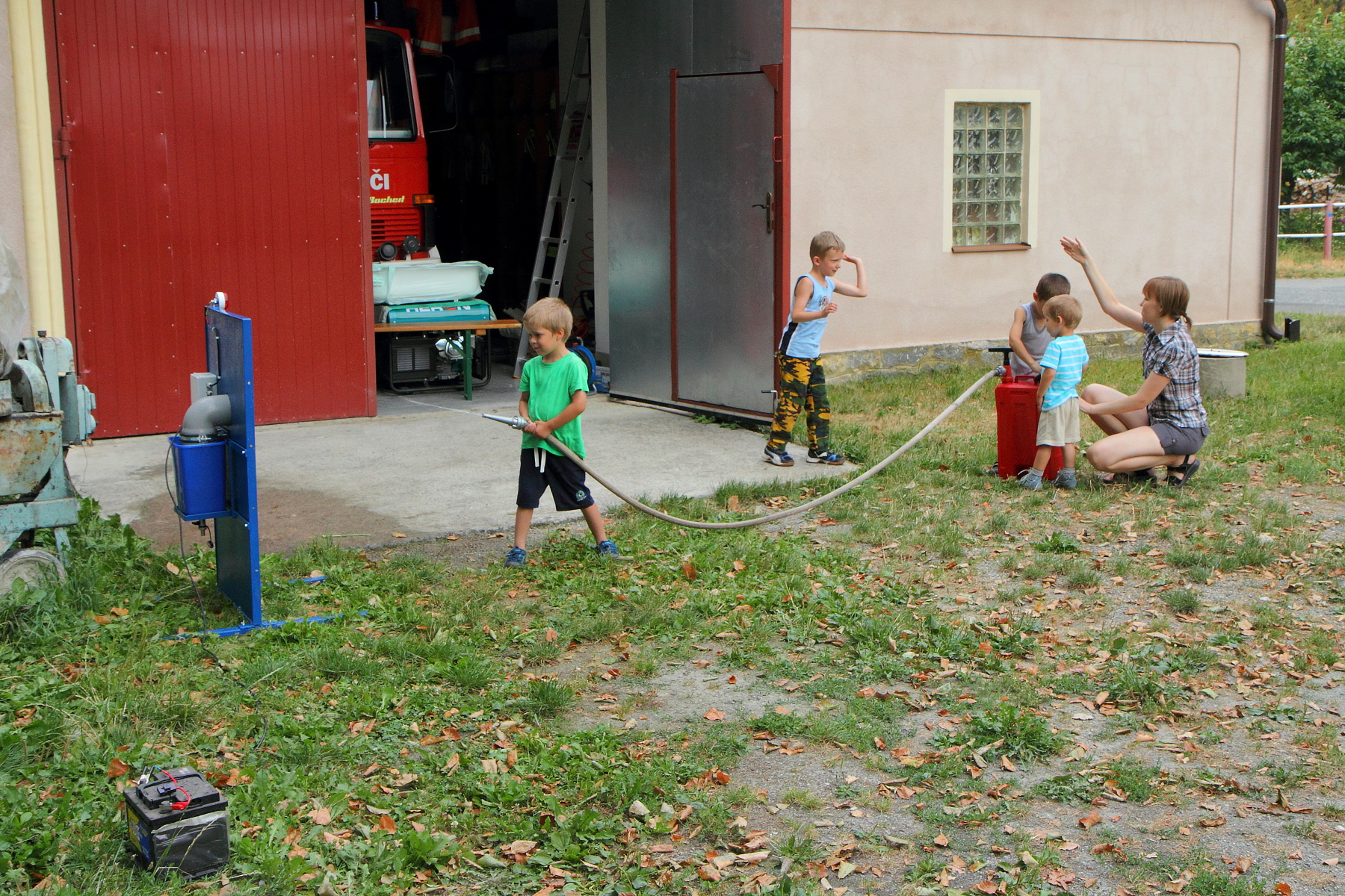 Děti návštěvníků si chtěly vyzkoušet práci s džberovou stříkačkou, ke které jsme poté donesli i nástřikový terč. Takže si mohly prověřit svou šikovnost při nástřiku vody do něj.