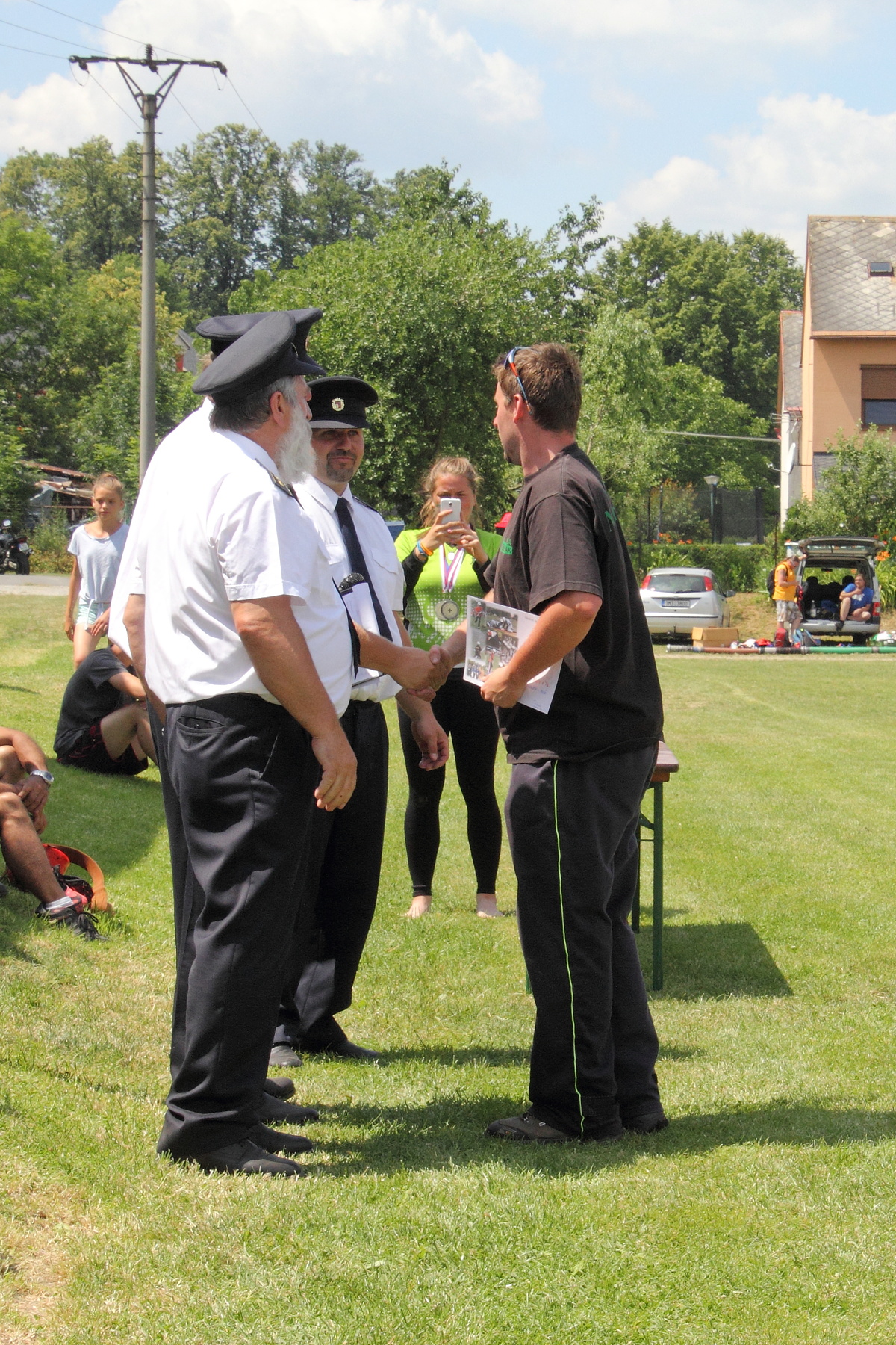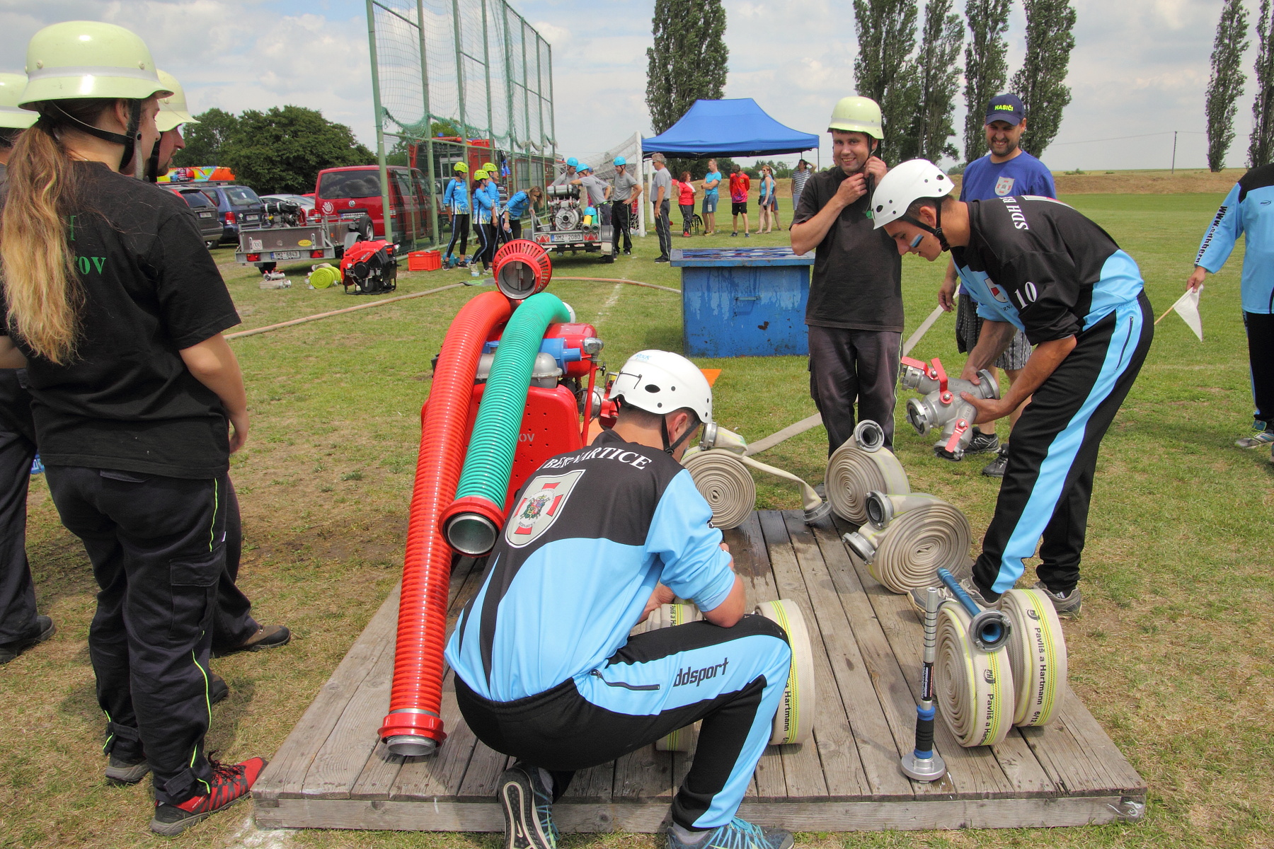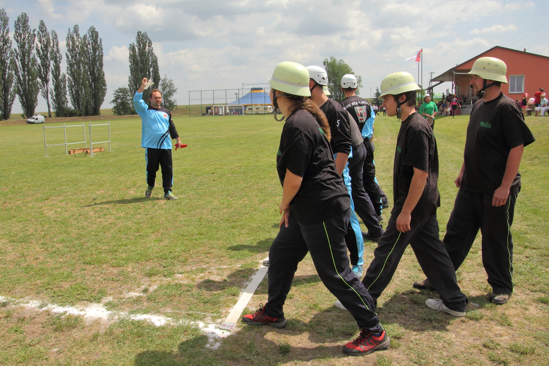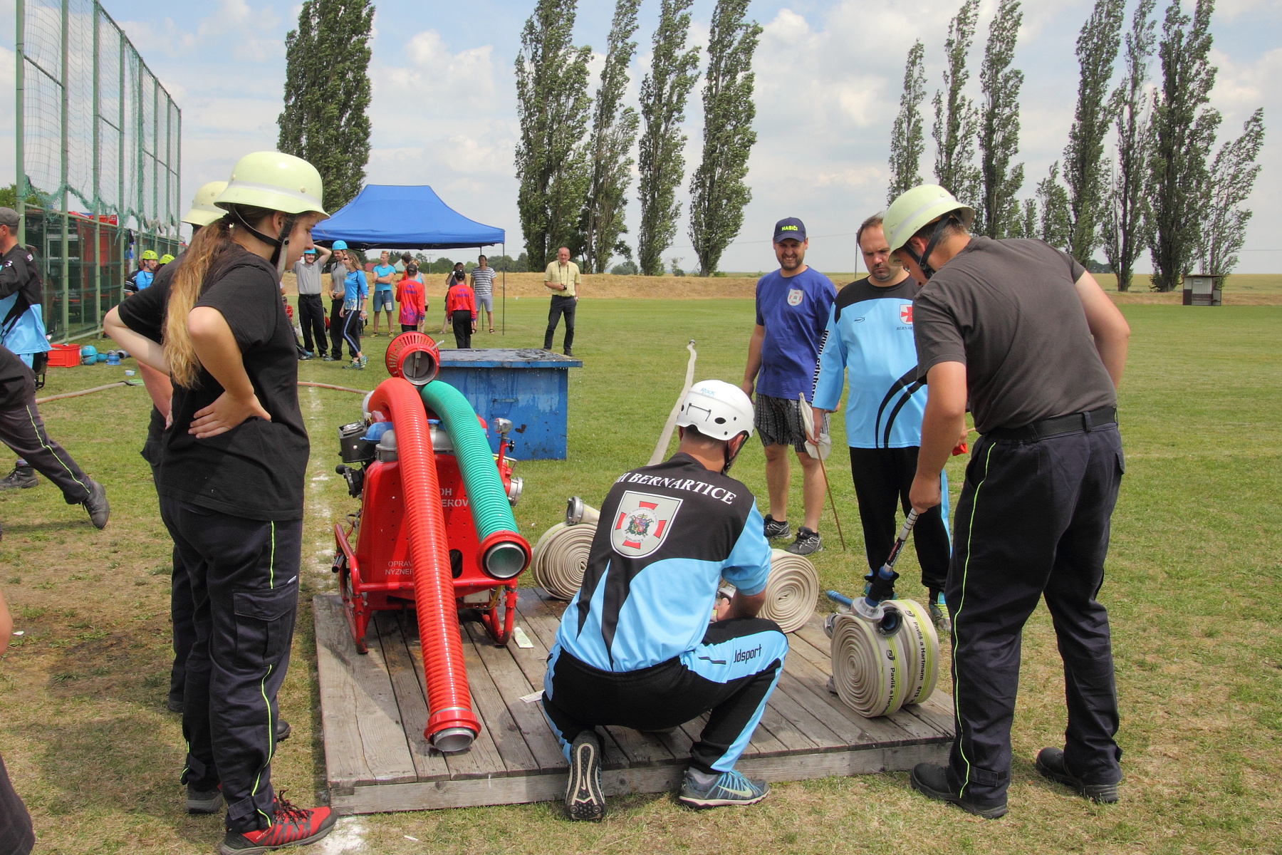 Z klasické sestavy našeho družstva chyběl jeden proudař a strojník. Zapůjčili jsme si tedy jednoho proudaře a dalšího závodníka na hadice B. Oba z Bernartic. I tak nám chyběl oproti jiným družstvům jeden soutěžící. Dále se s námi na soutěž vyrazila podívat i jedna mladá hasička, která již u nich musí končit a přejde k dospělým. Po jedné hodině byl společný nástup mladých hasičů a dospělých. Při něm proběhlo vyhlášení výsledků celého dne.