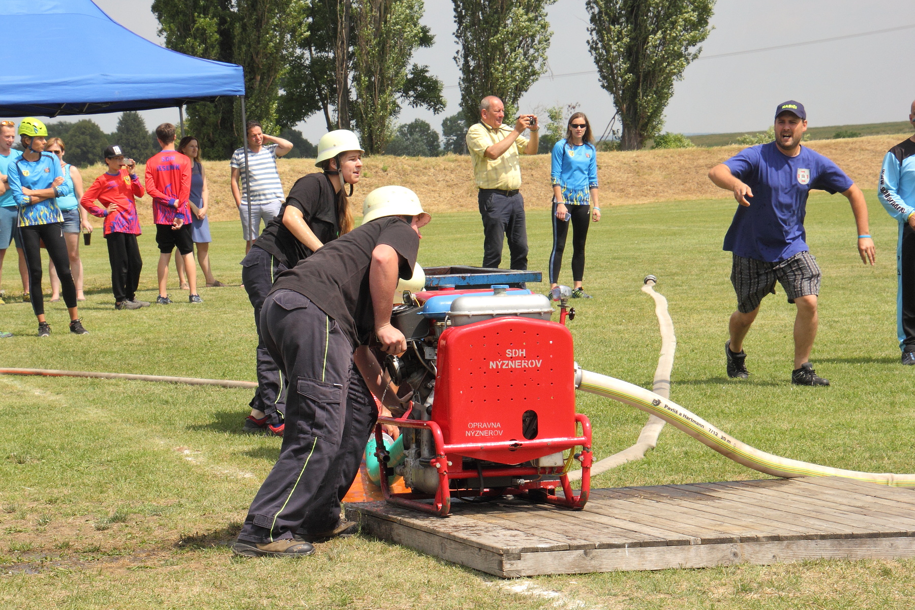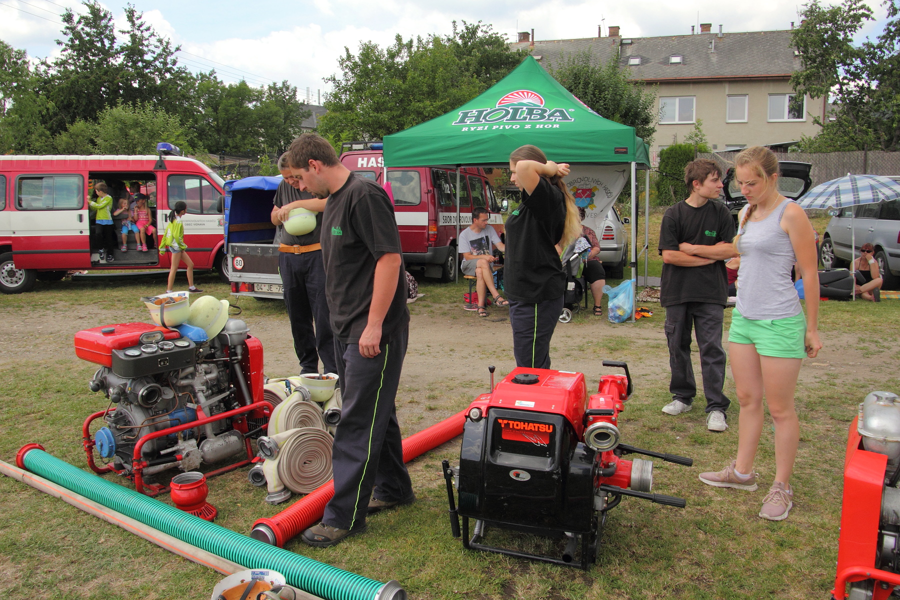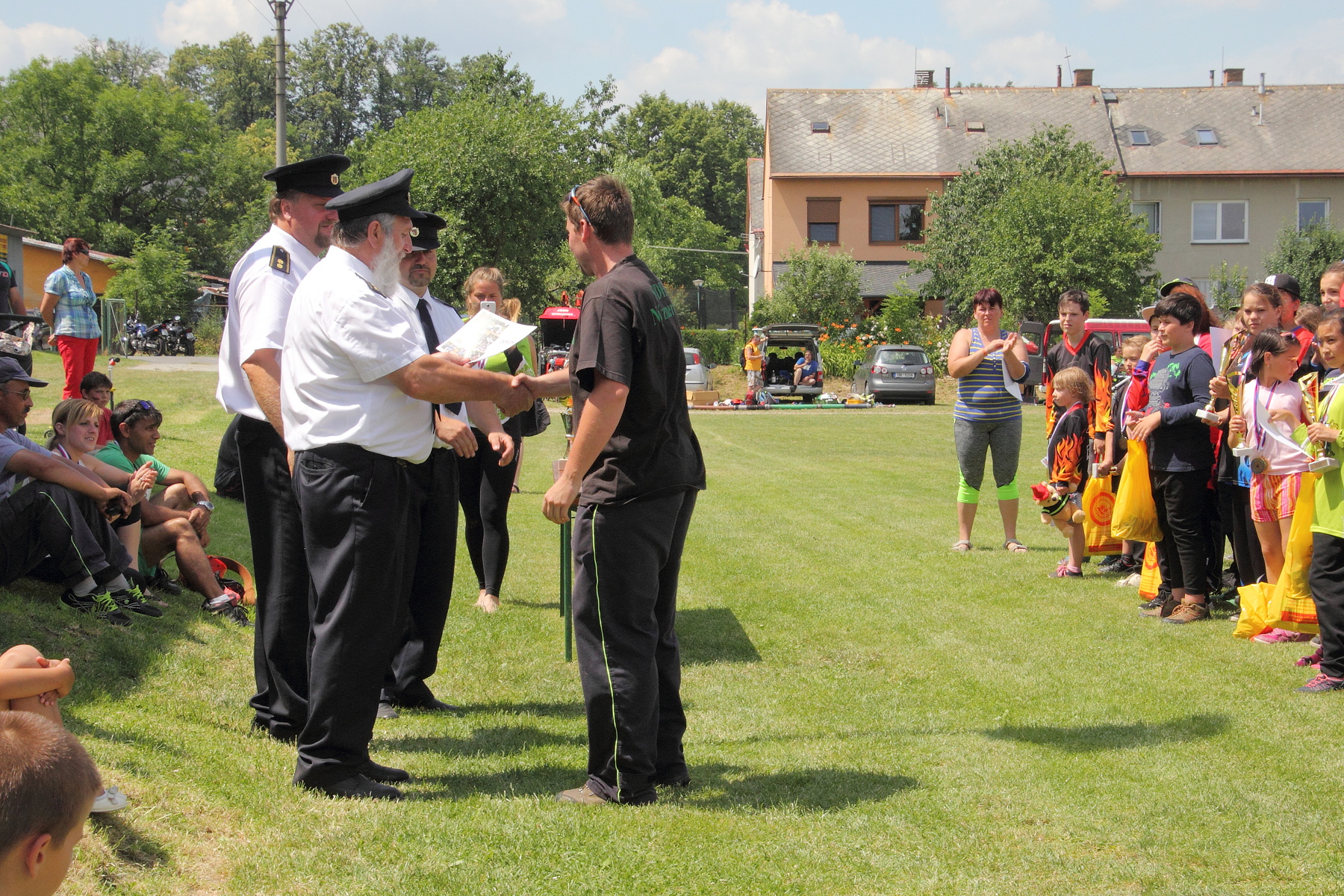 Z klasické sestavy našeho družstva chyběl jeden proudař a strojník. Zapůjčili jsme si tedy jednoho proudaře a dalšího závodníka na hadice B. Oba z Bernartic. I tak nám chyběl oproti jiným družstvům jeden soutěžící. Dále se s námi na soutěž vyrazila podívat i jedna mladá hasička, která již u nich musí končit a přejde k dospělým. Po jedné hodině byl společný nástup mladých hasičů a dospělých. Při něm proběhlo vyhlášení výsledků celého dne.