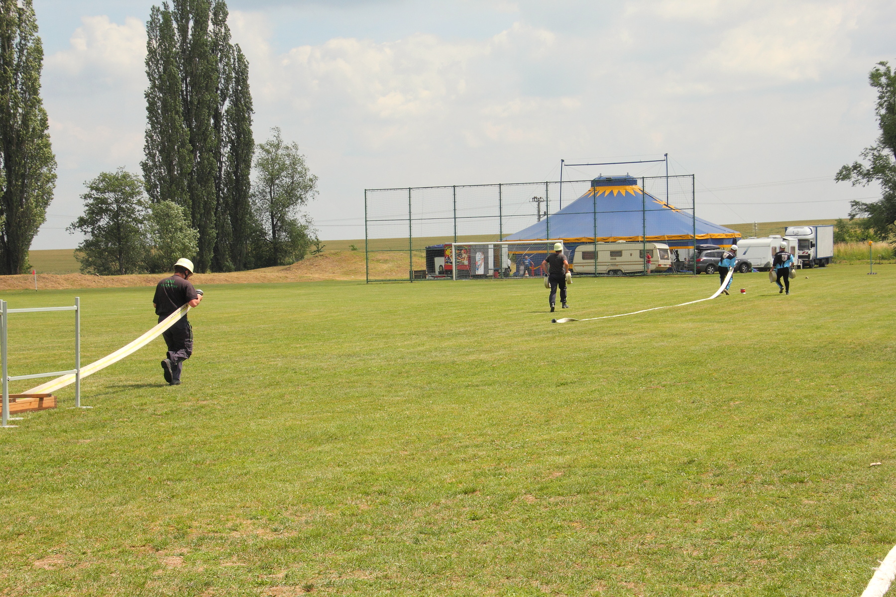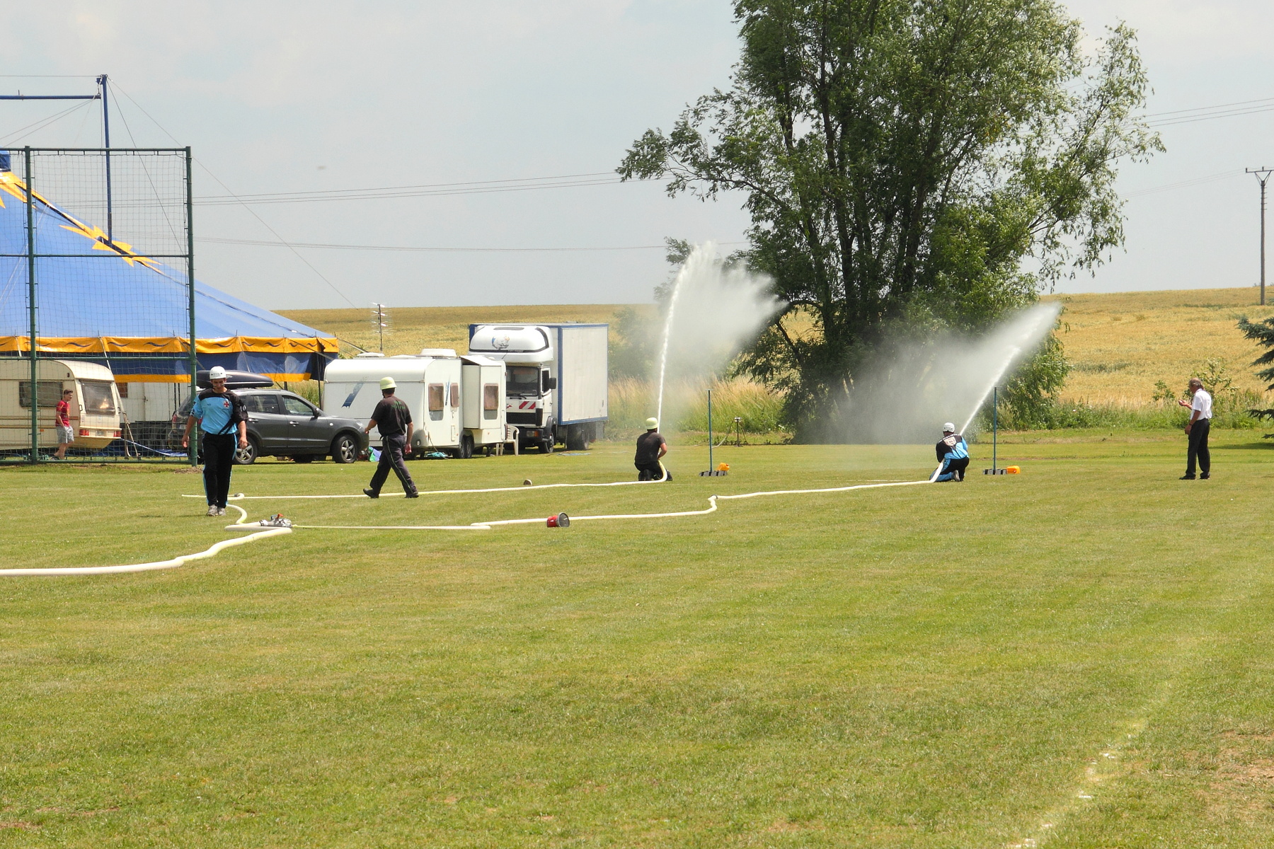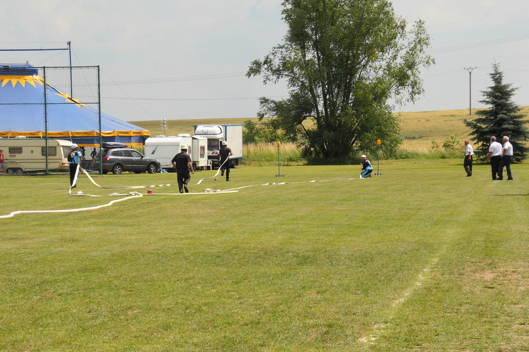 Již od rána probíhala soutěž mladých hasičů, takže jsme se po příjezdu nahlásili a čekali, až začne část dospělých. Trať této soutěže má oproti klasickému požárnímu útoku navíc v místě poloviny první hadice B umístěny koleje. A po jejich straně dva plotky jako zúžení, kterým projdou soutěžící jen postupně. Proto byl navýšen i počet soutěžících na osm, oproti klasickým sedmi.