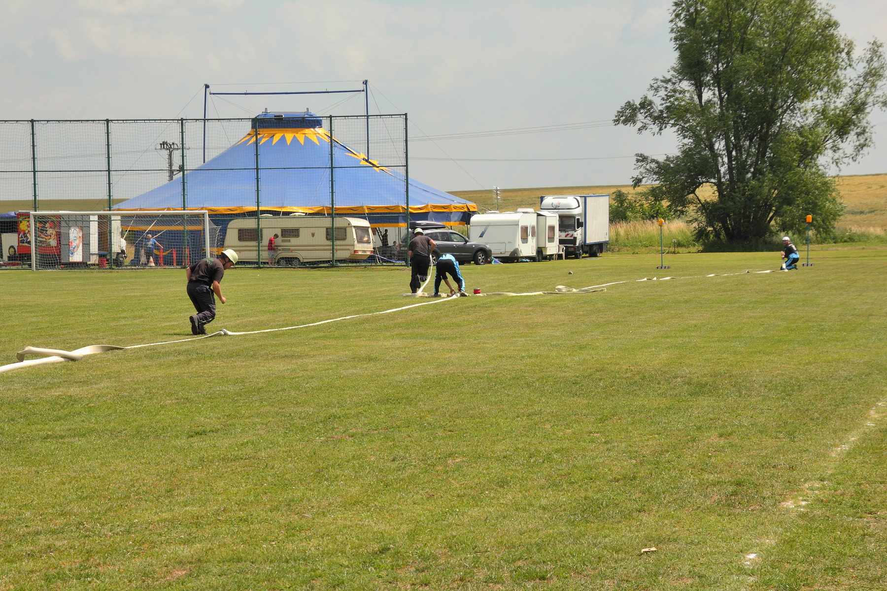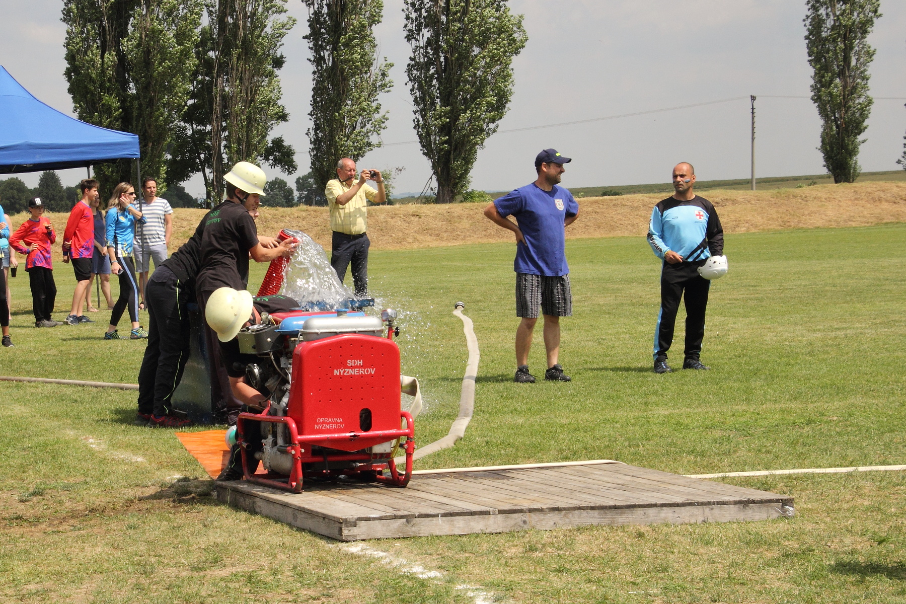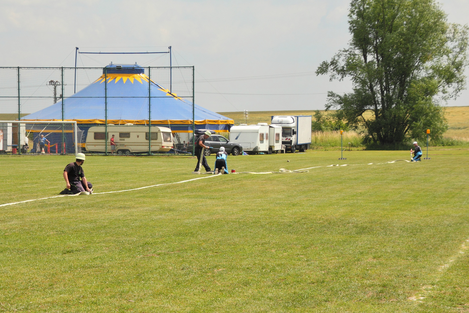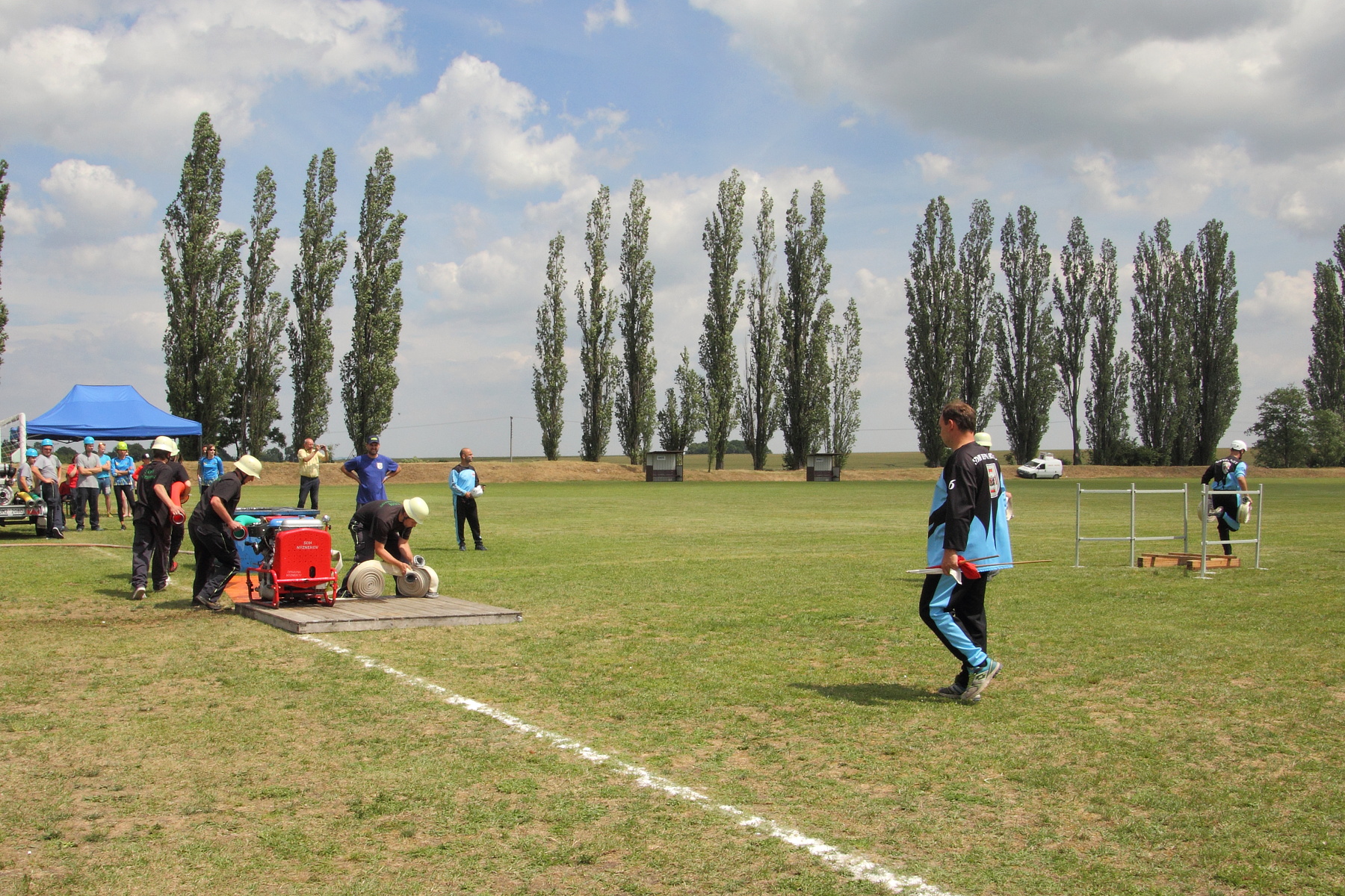 Již od rána probíhala soutěž mladých hasičů, takže jsme se po příjezdu nahlásili a čekali, až začne část dospělých. Trať této soutěže má oproti klasickému požárnímu útoku navíc v místě poloviny první hadice B umístěny koleje. A po jejich straně dva plotky jako zúžení, kterým projdou soutěžící jen postupně. Proto byl navýšen i počet soutěžících na osm, oproti klasickým sedmi.