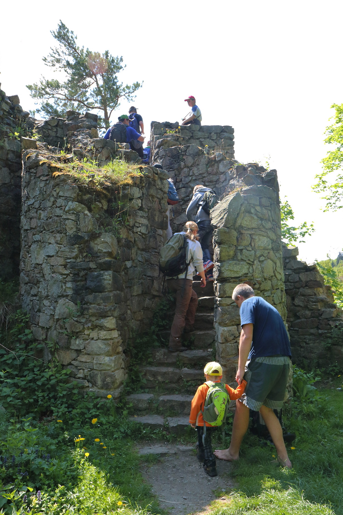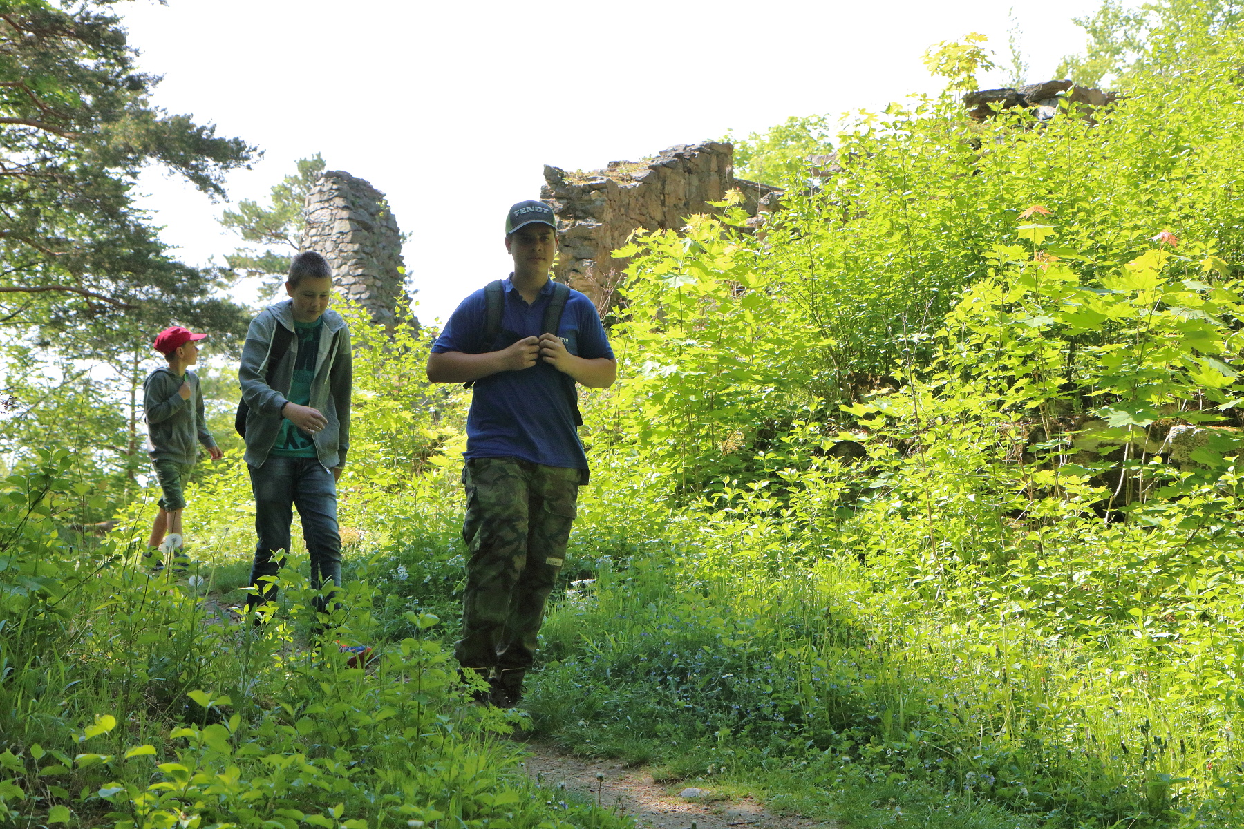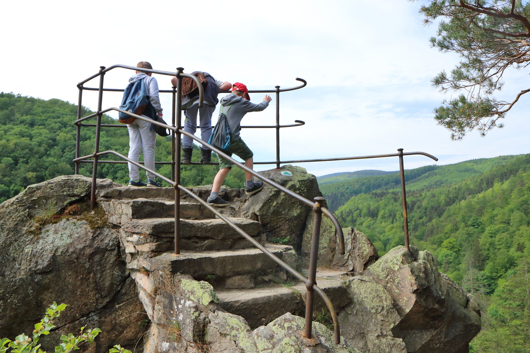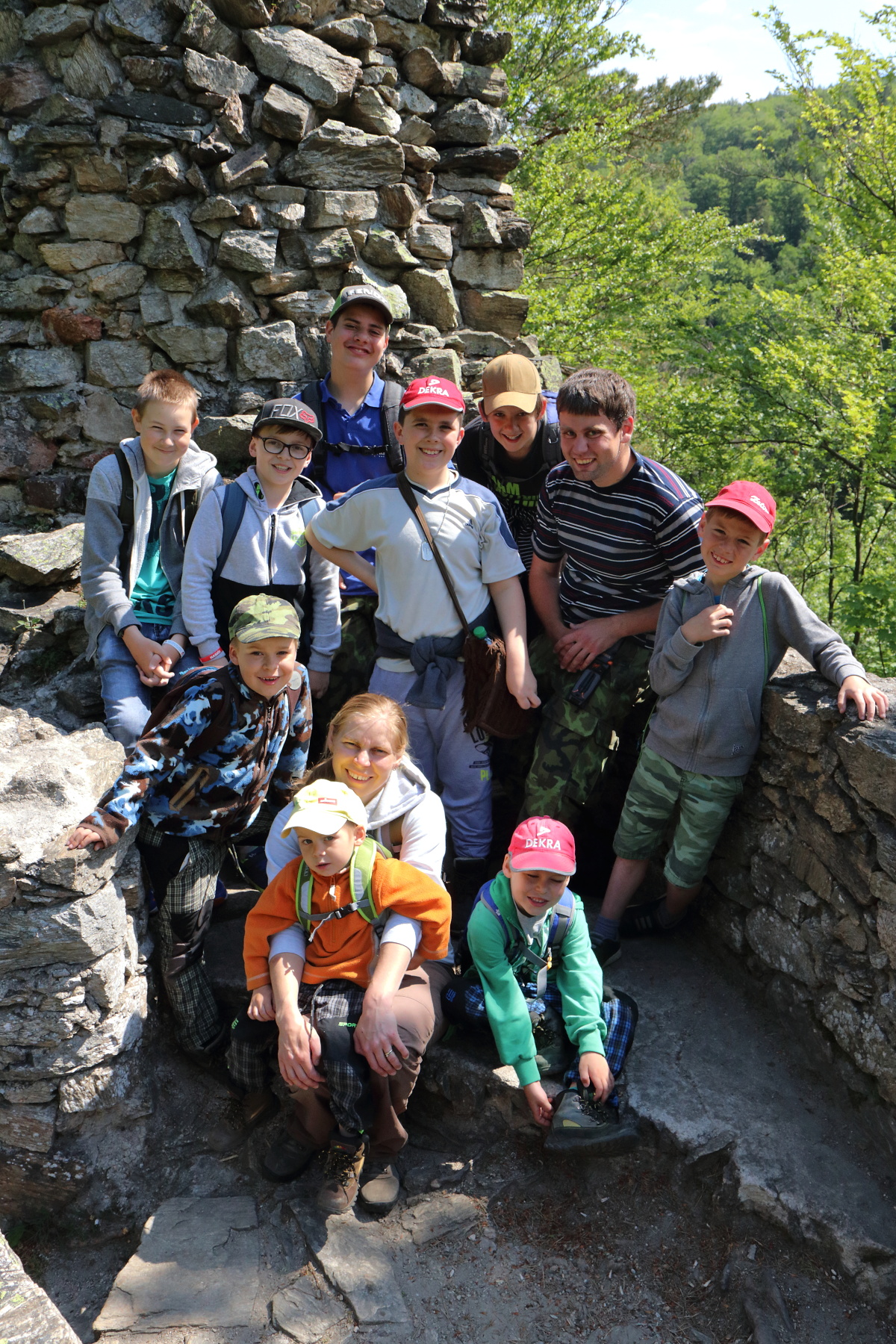 Dále jsme pokračovali na Čertovu kazatelnu. Zde jsme se mohli kochat pěkným výhled do Račího údolí. V blízkém dřevěném přístřešku jsme pak posvačili. Posilněni jsme dále pokračovali na zříceninu hradu Rychleby. Kde jsme po prozkoumání místa a vystoupání na zbytek vnější věže udělali společnou fotografii.