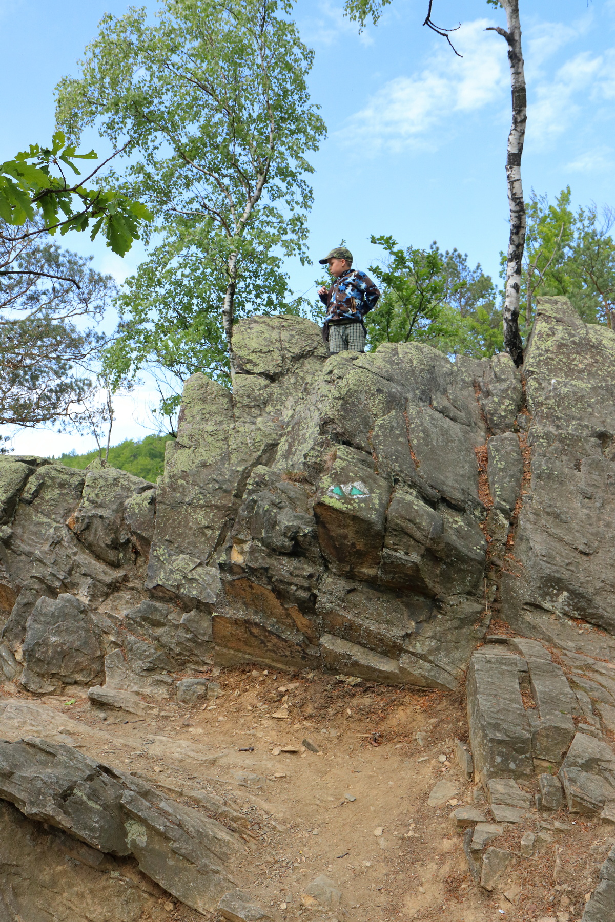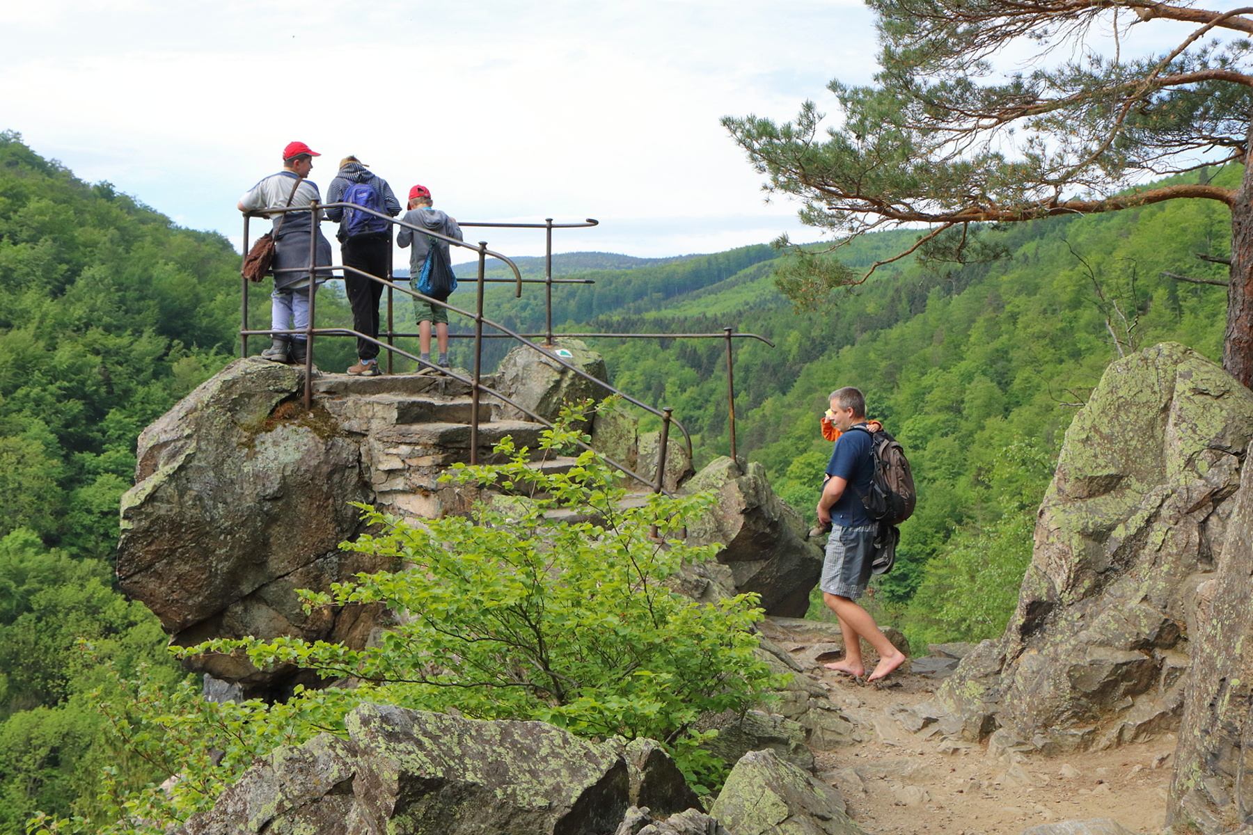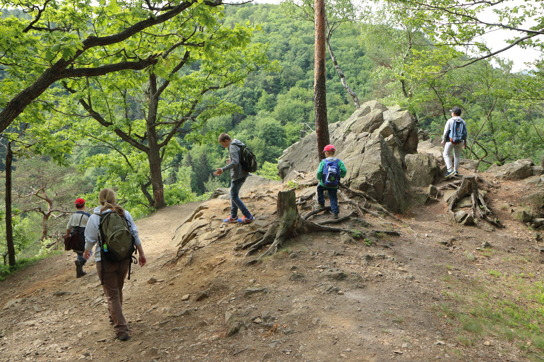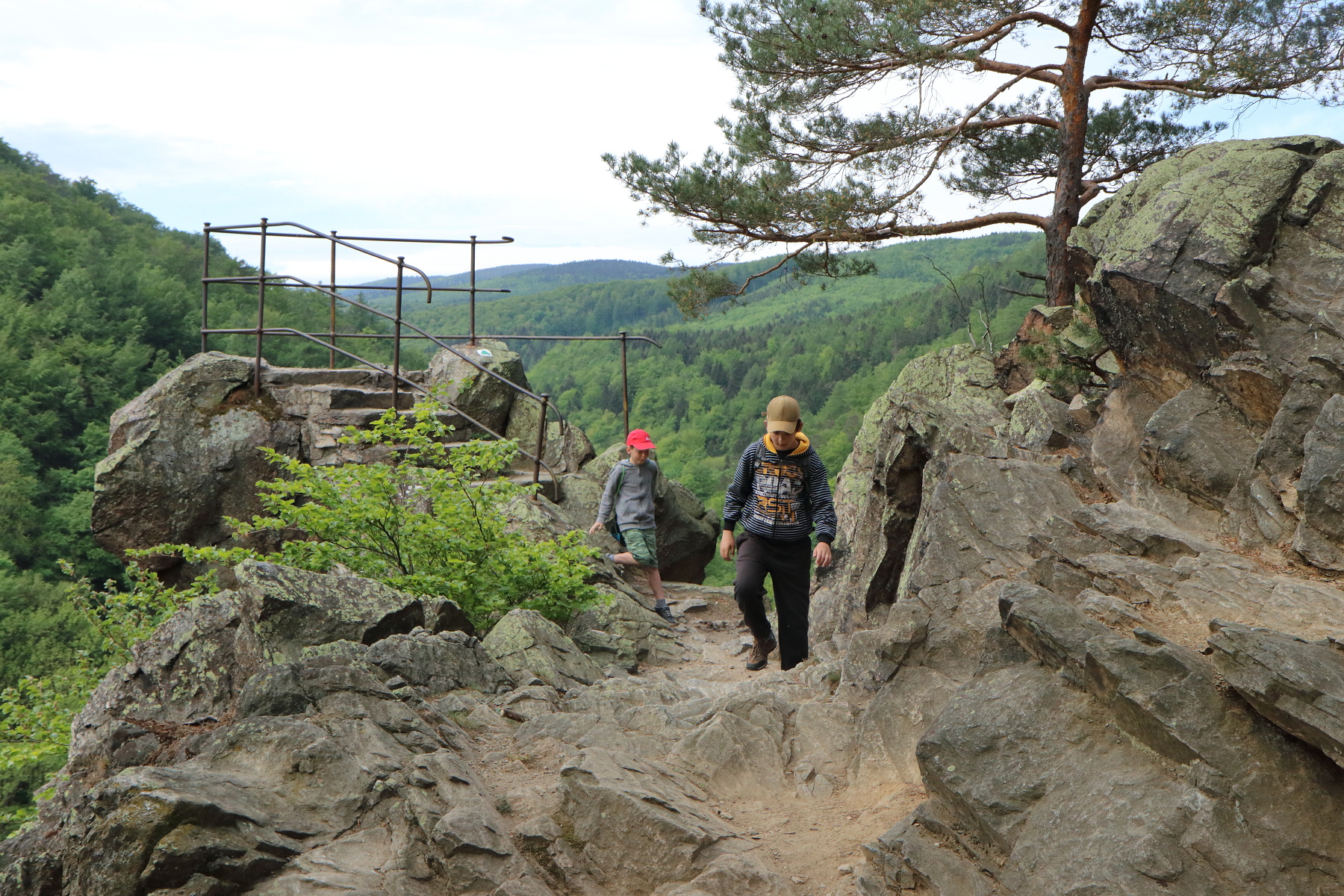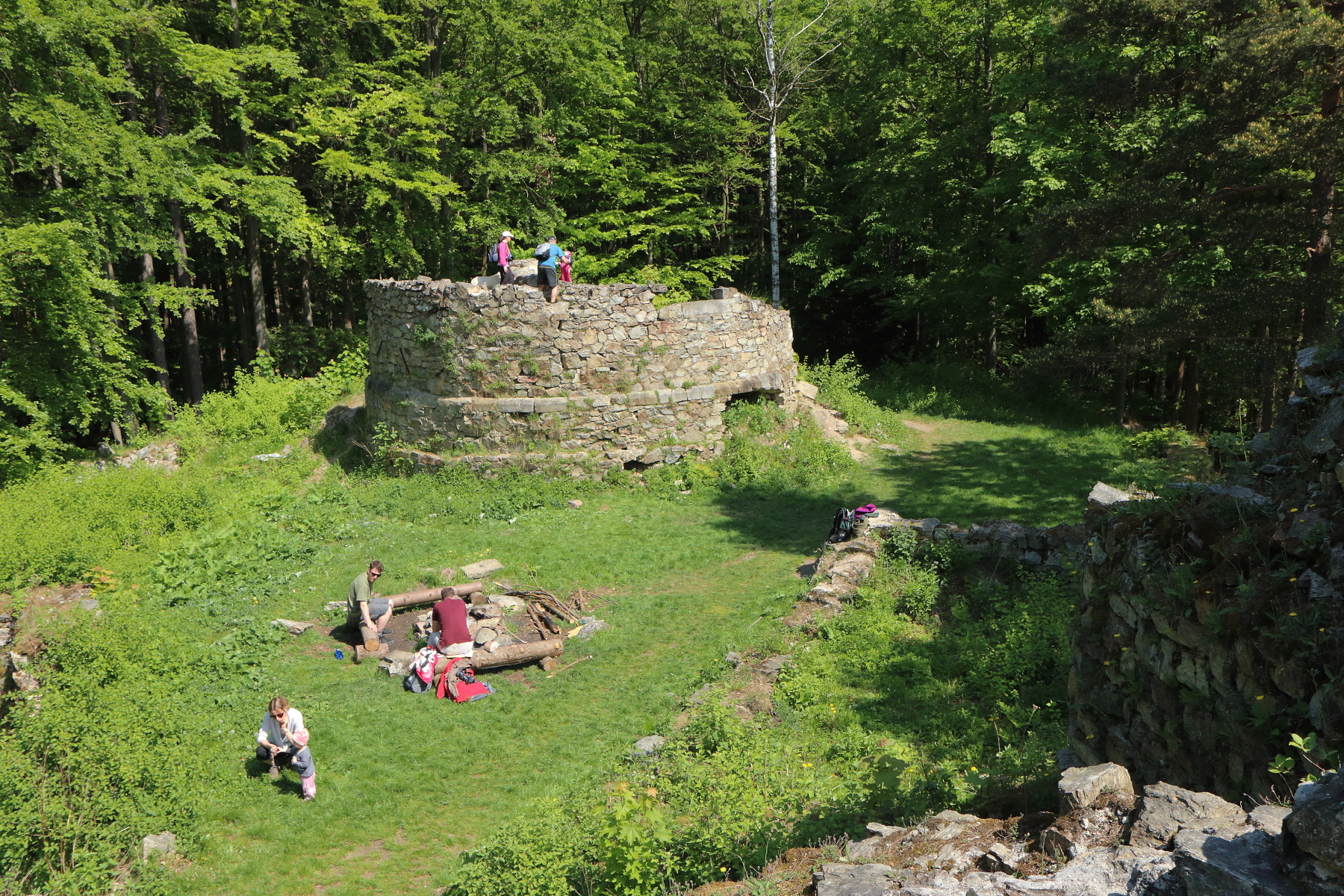 Dále jsme pokračovali na Čertovu kazatelnu. Zde jsme se mohli kochat pěkným výhled do Račího údolí. V blízkém dřevěném přístřešku jsme pak posvačili. Posilněni jsme dále pokračovali na zříceninu hradu Rychleby. Kde jsme po prozkoumání místa a vystoupání na zbytek vnější věže udělali společnou fotografii.