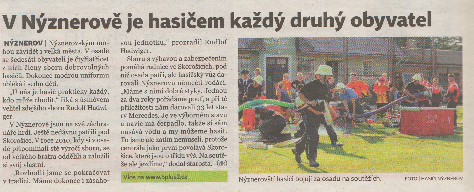 Našeho sboru si nedávno všiml i tisk, konkrétně regionální týdeník 5plus2, který 21 března zveřejnil o SDH Nýznerov krátký článek, který naleznete ZDE nebo po zobrazení podrobností tohoto příspěvku naskenovaný na obrázku. Úvodní odstavec článku praví následující: